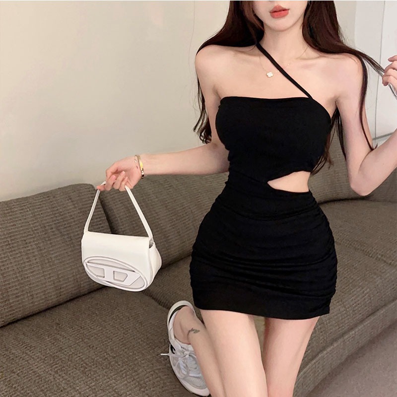镂空露腰一字肩挂脖吊带连衣裙女夏季纯欲甜辣妹性感包臀抹胸裙子
