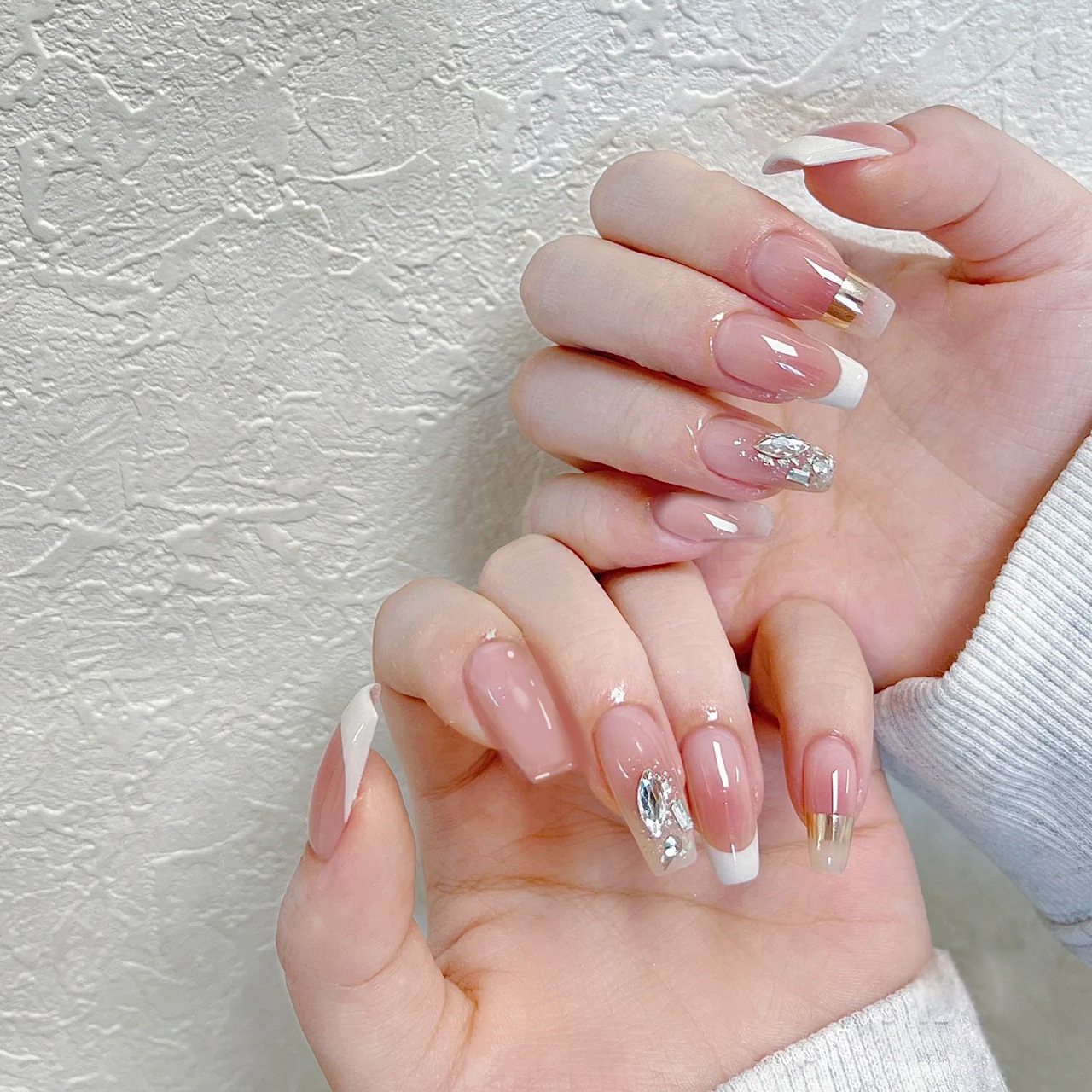 法式穿戴甲粉嫩白边腮红甲甲片闪粉水钻假指甲贴片温柔大气简约款