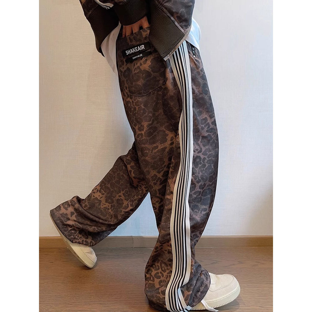 欧美潮牌复古宽松豹纹数码印花拼接条纹休闲裤男直筒裤春秋季新款