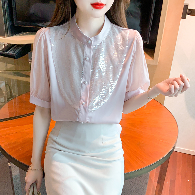夏季新款韩版时尚百搭圆领亮片拼接气质洋气短袖衬衫女上衣