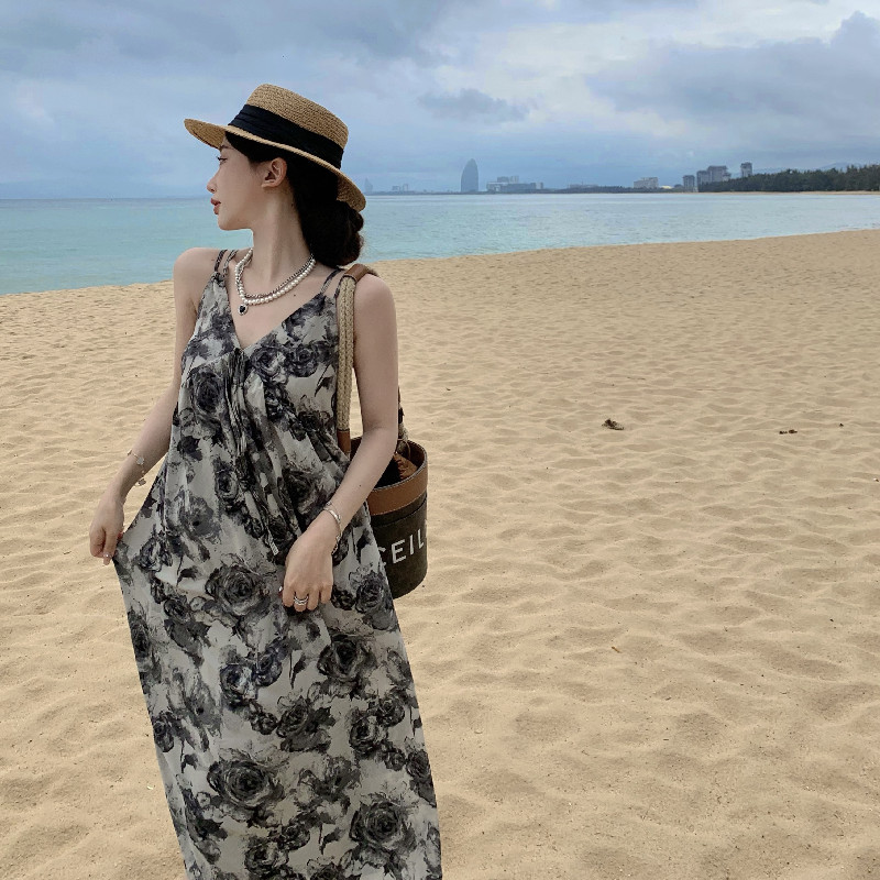 夏季吊带连衣裙女度假风收腰显瘦水墨印花长款v领雪纺裙子