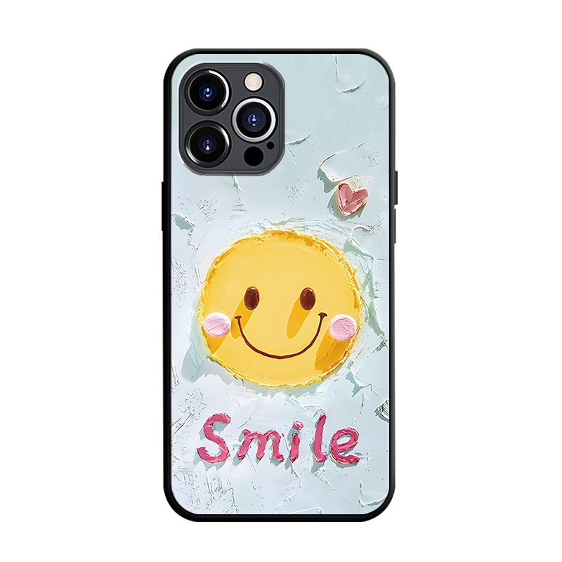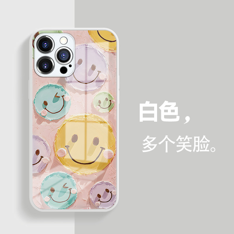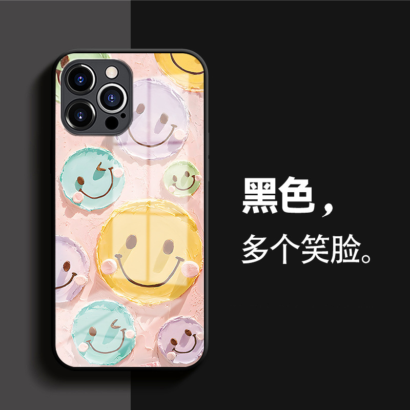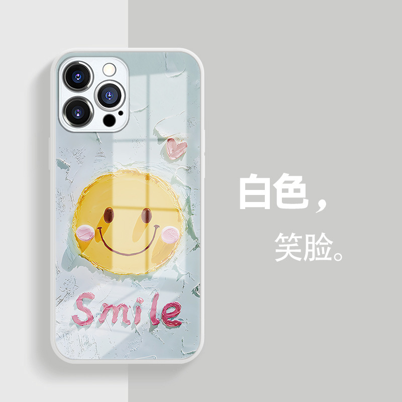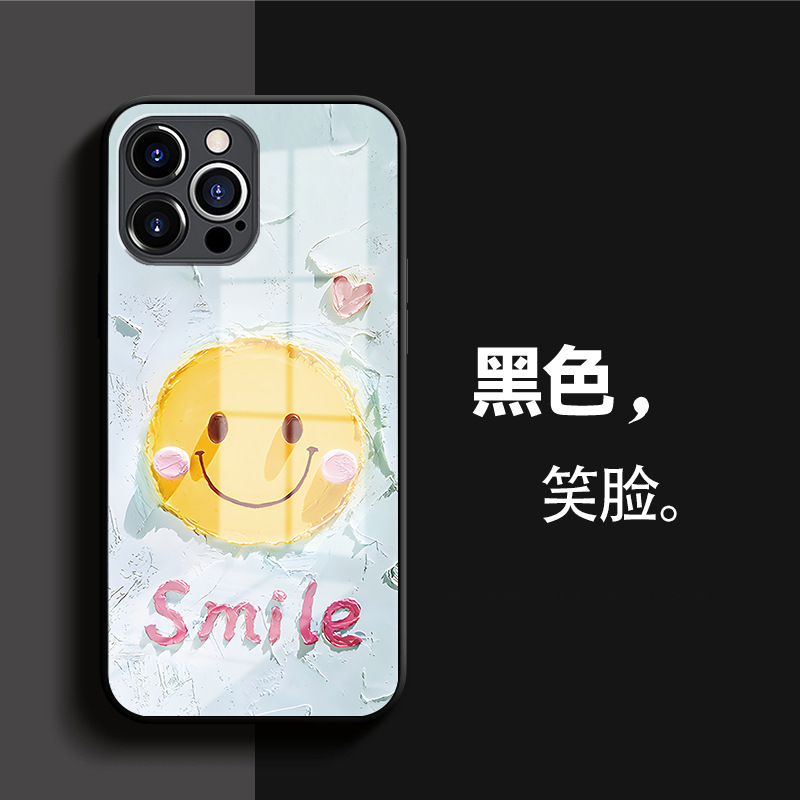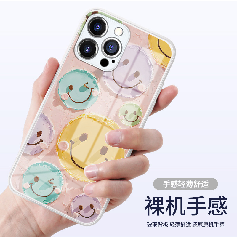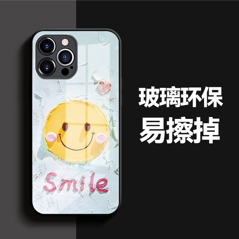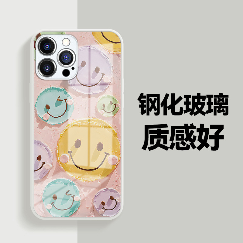 油画笑脸苹果15手机壳iPhone13/14Promax玻璃壳11/12情侣XR全包