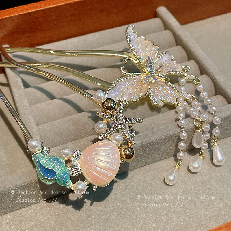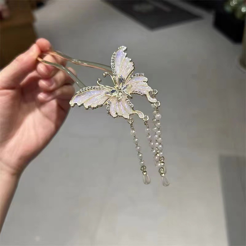 蝴蝶镶钻珍珠流苏发簪新中式古风气质盘发发杈国潮高级感发饰