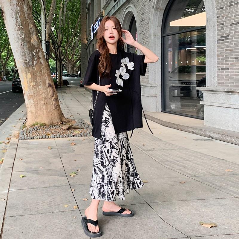 新中式套装裙女夏新款国风不规则开叉t恤水墨画半身裙两件套