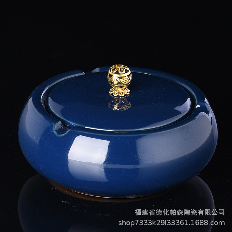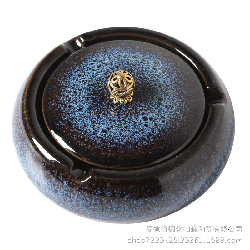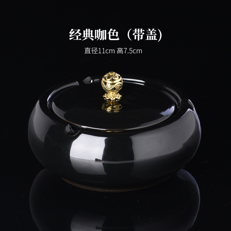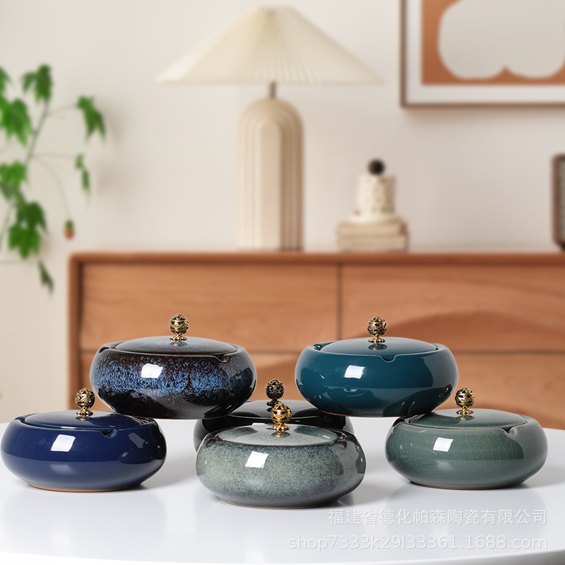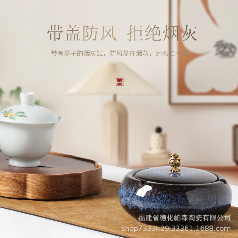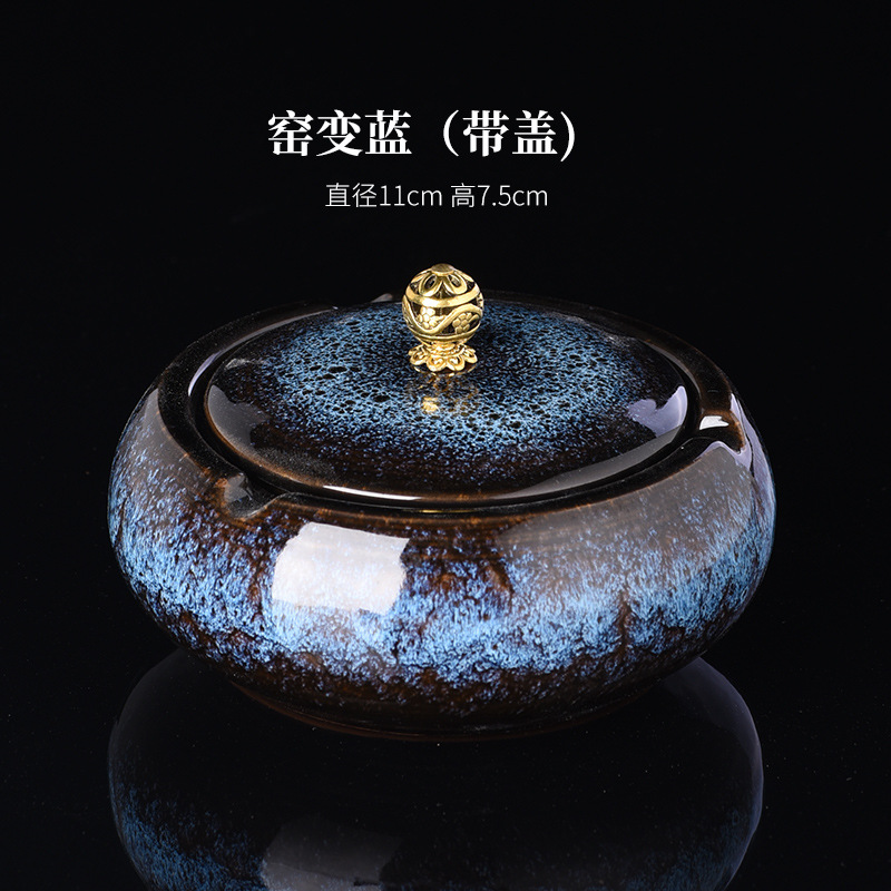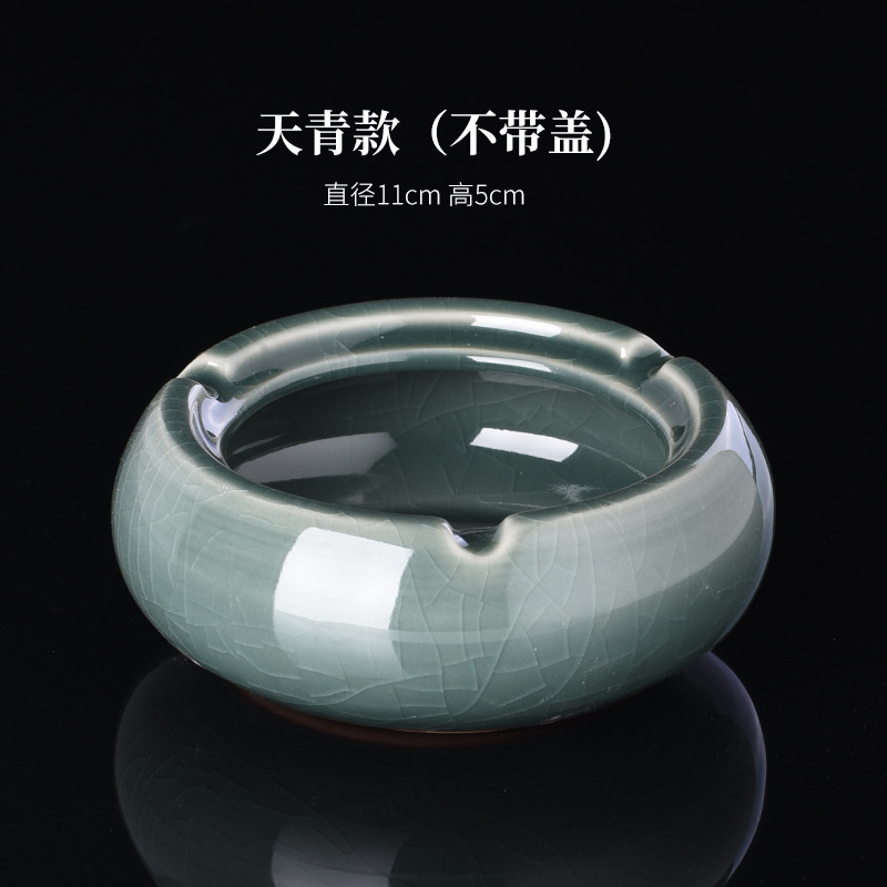 哥窑陶瓷烟灰缸新中式简约防风防飞带盖家用客厅办公复古