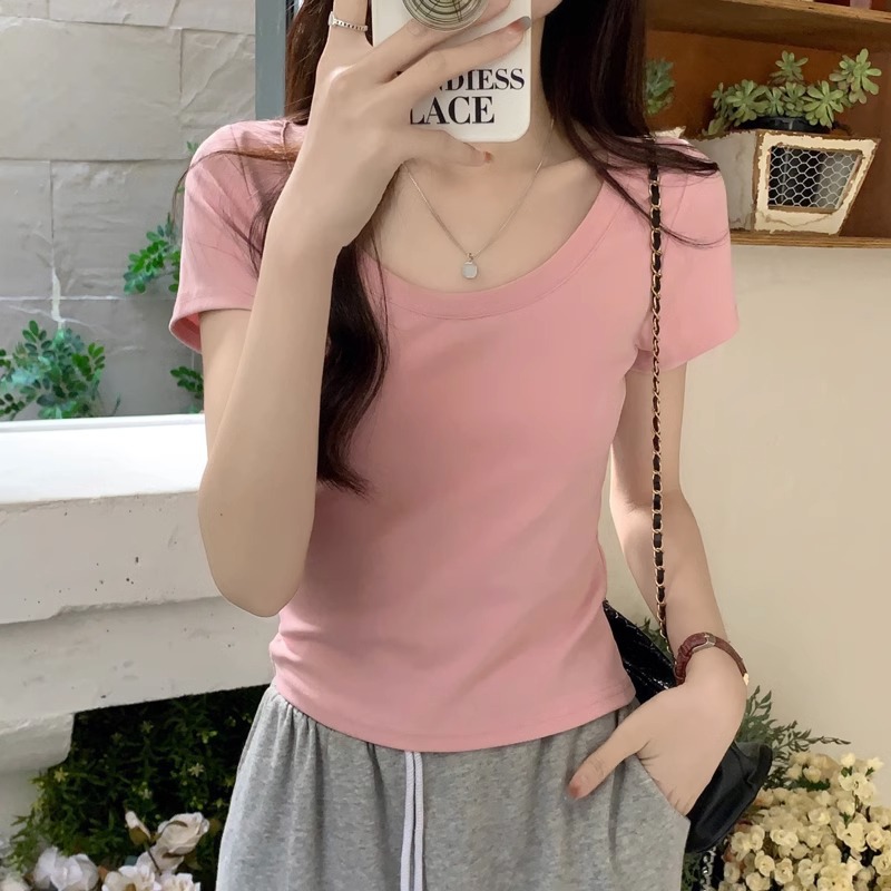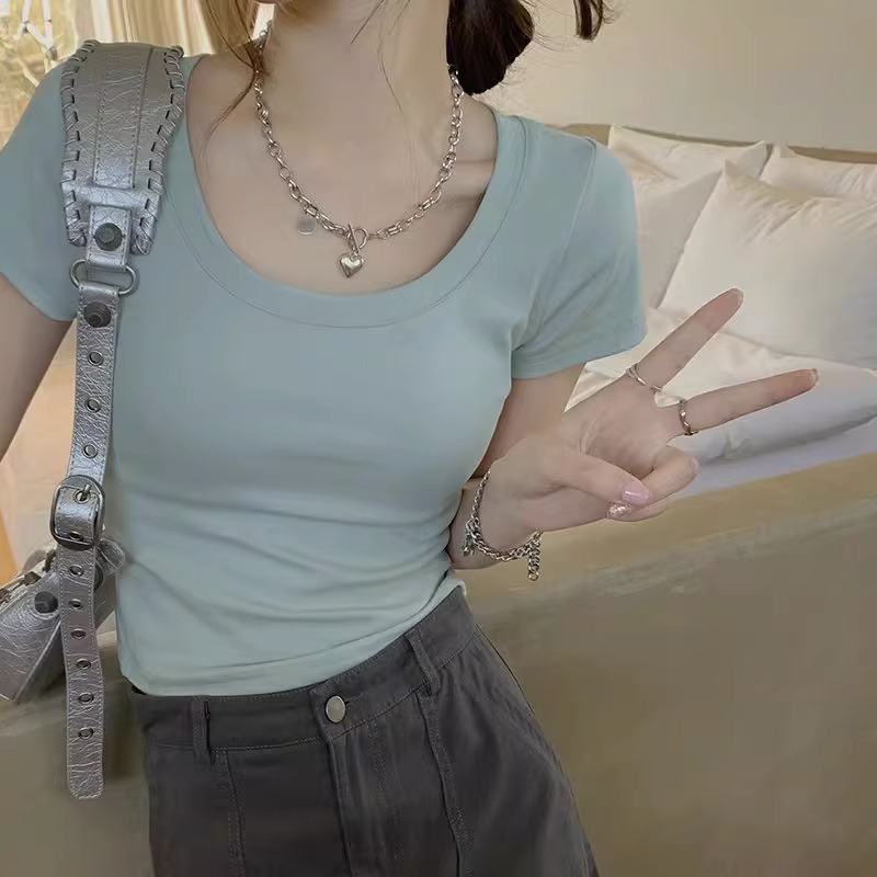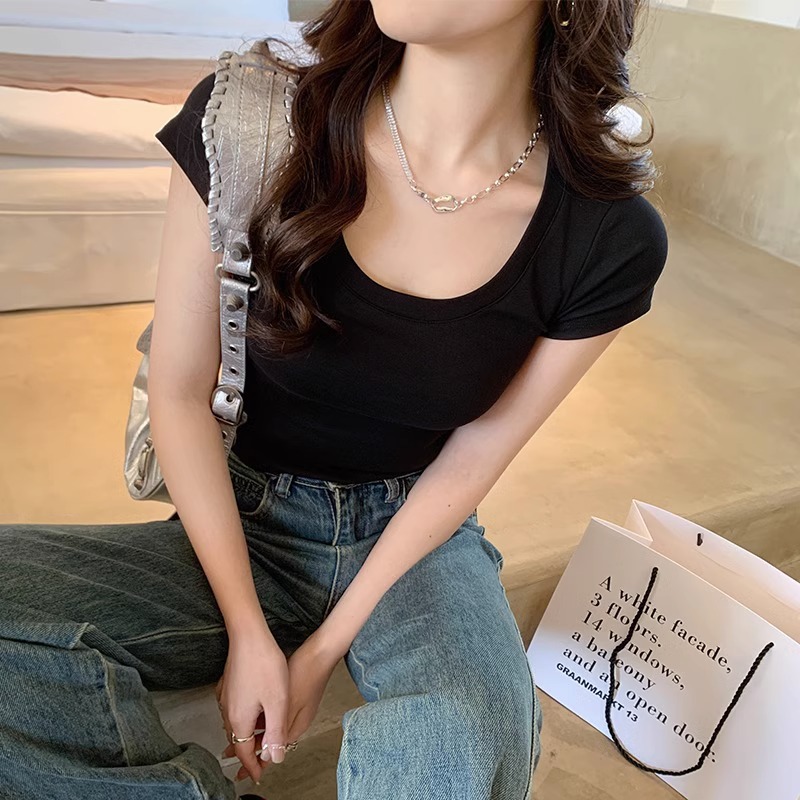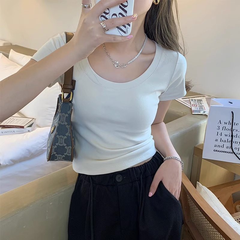 纯欲U领锁骨t恤女正肩短袖夏季紧身辣妹纯棉露脐短款上衣