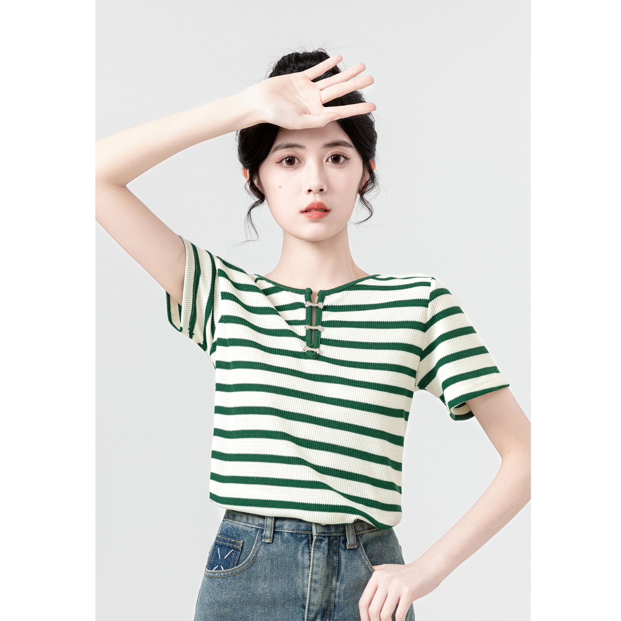 绿色条纹短袖恤女夏2025新款小众设计感圆领正肩体恤小个子上衣
