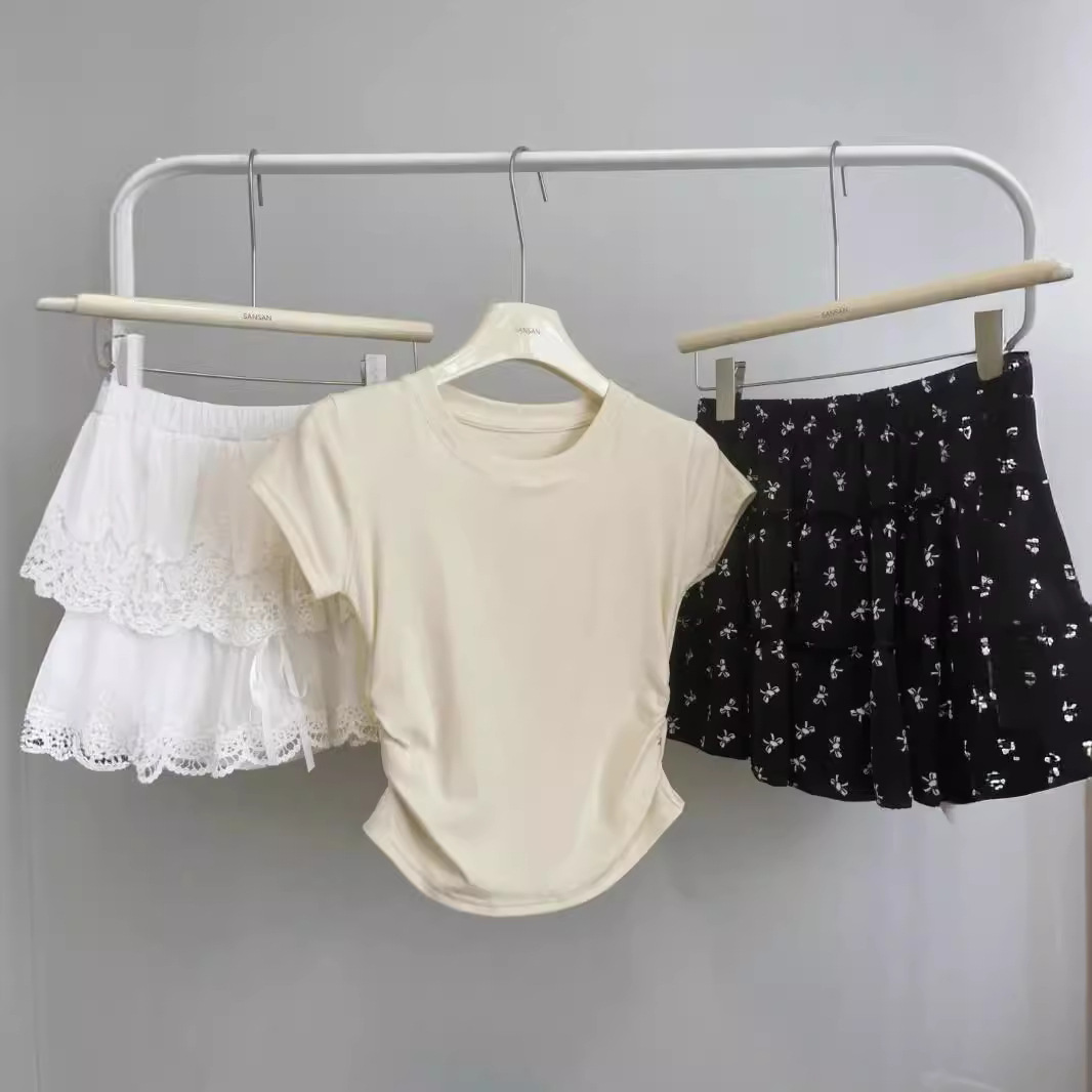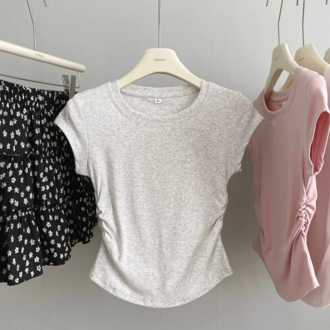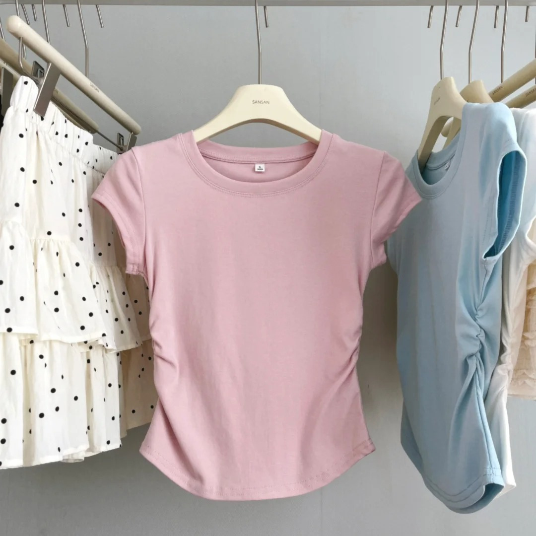 奶蓝色正肩T恤女夏季少女感收腰显瘦抽褶上衣小个子辣妹短袖