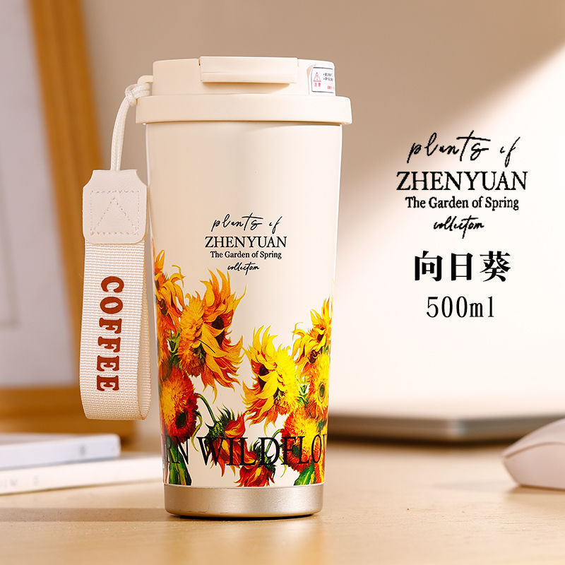 高档花朵咖啡杯316不锈钢高颜值保温杯女生便携国风双饮水杯