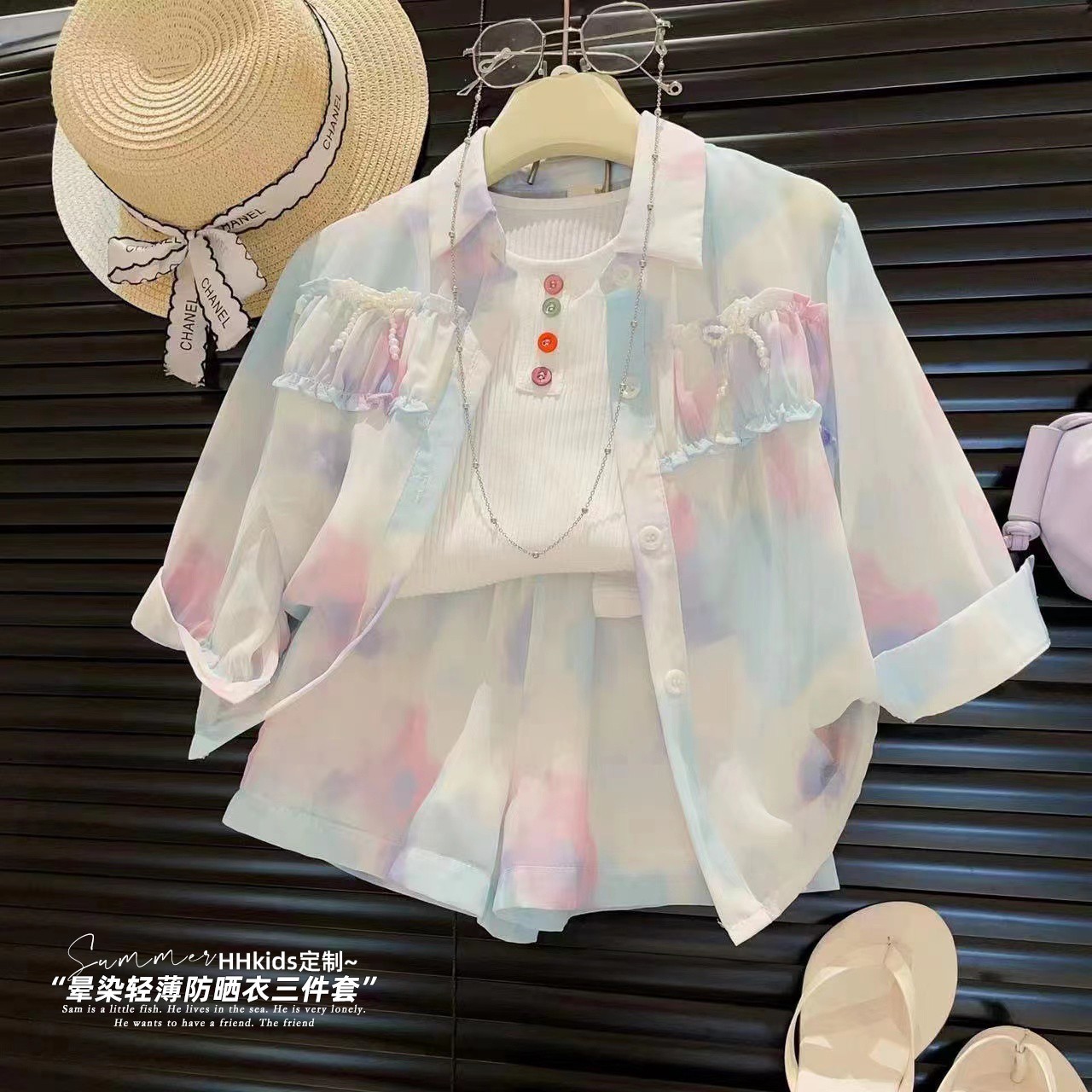 新品女童渐变拼色洋气外套短裤打底衫防晒三件套2025夏装两件套