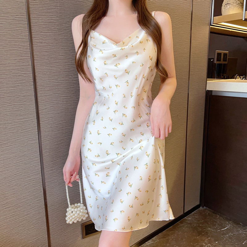 ins荡领印花睡裙女士夏季吊带冰雪丝睡衣纯欲风小清新碎花裙子