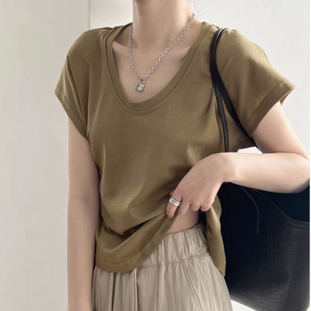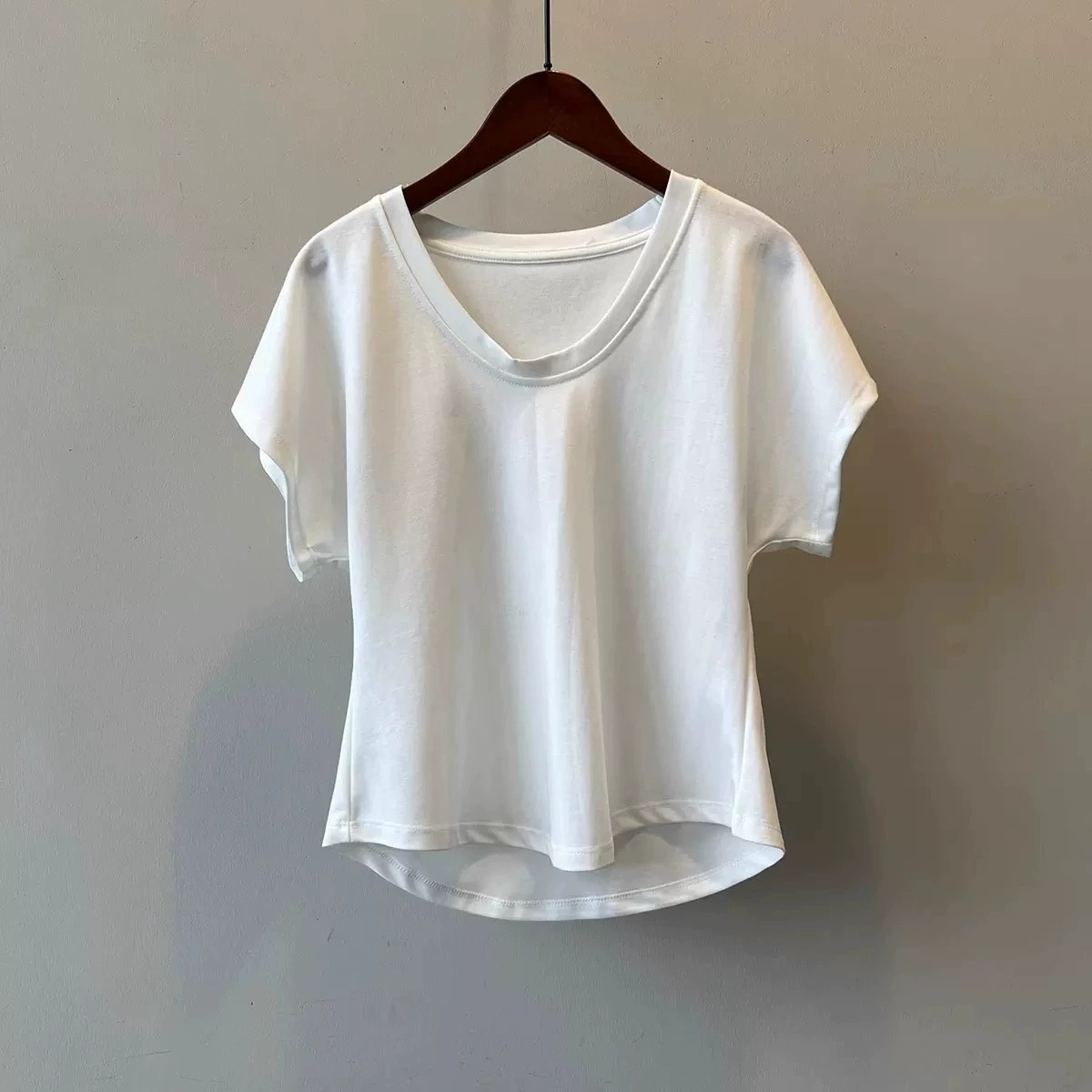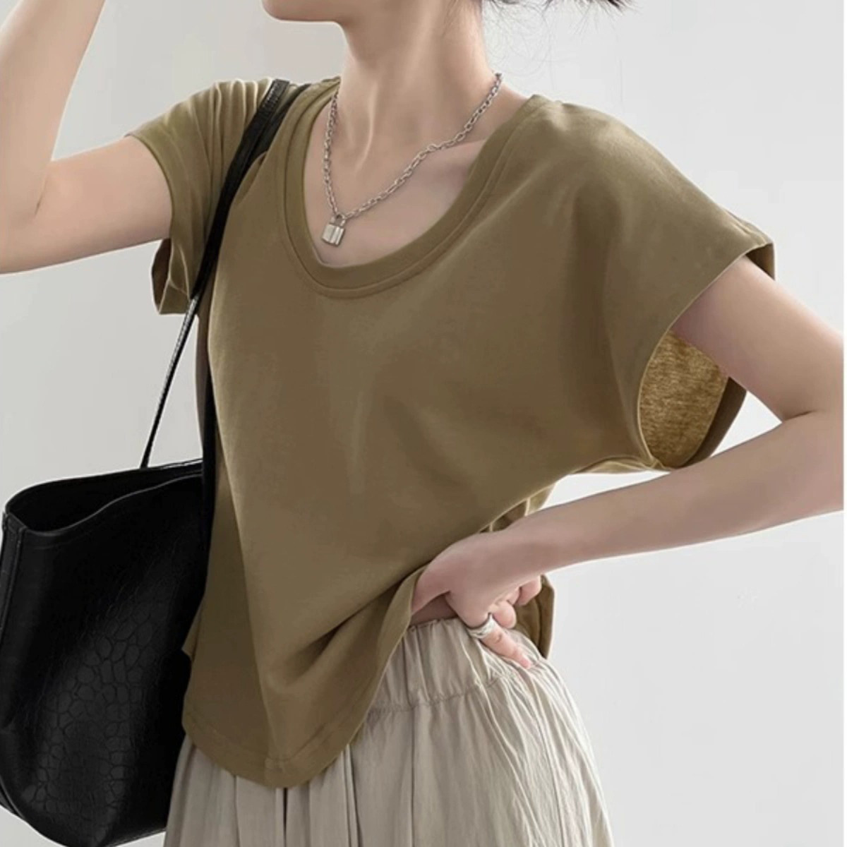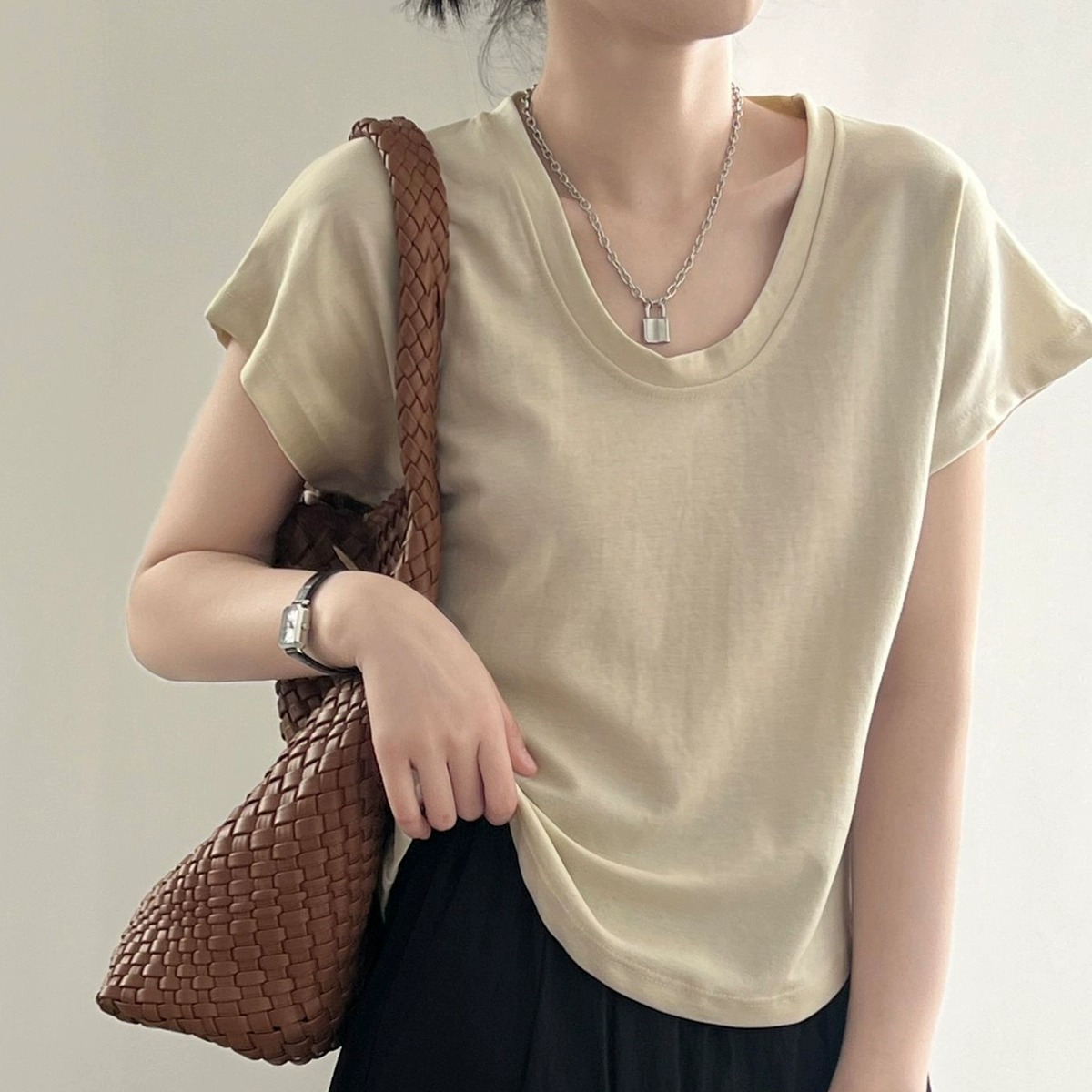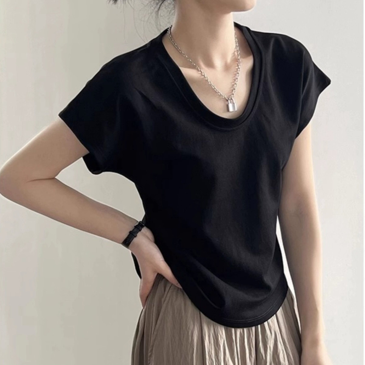 大U领锁骨t恤女小飞袖上衣夏简约法式慵懒薄款设计感短袖