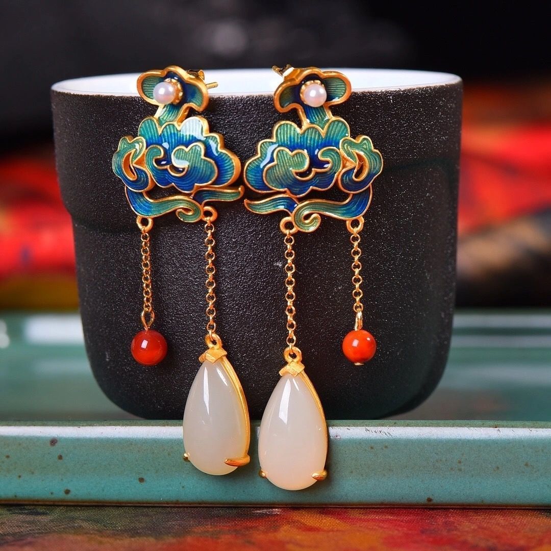 和田烧蓝如意玉兰花复古宫廷镀金色耳钉流苏小花蕙质兰心耳钉