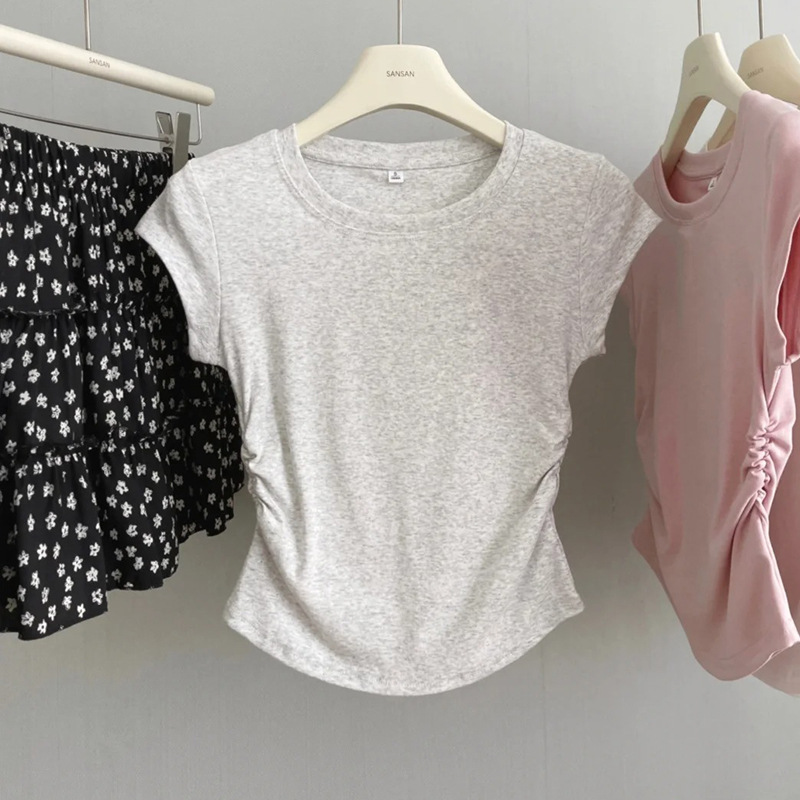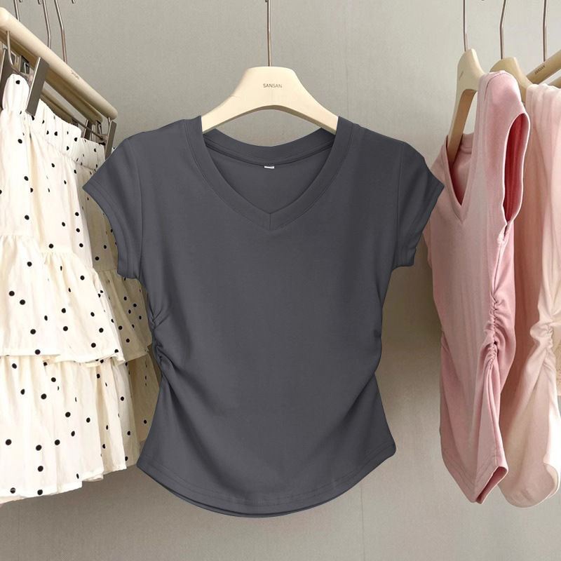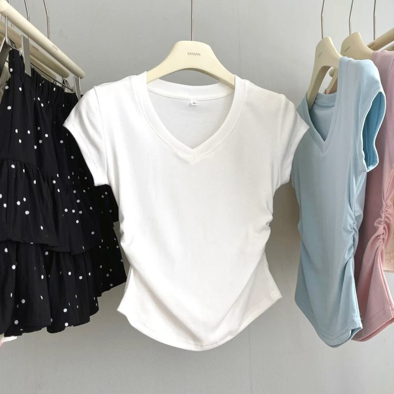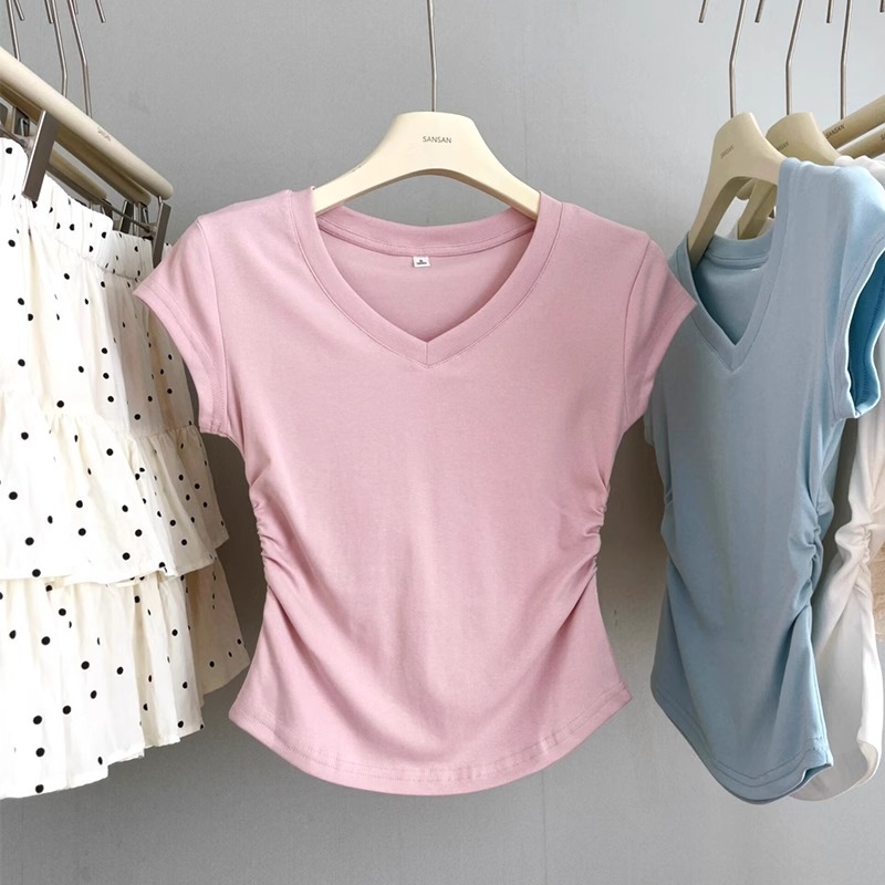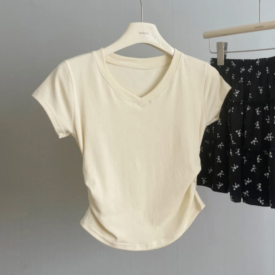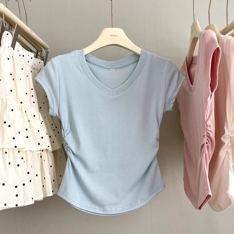 韩系气质甜妹纯色V领正肩T恤女夏季侧腰抽褶掐腰显瘦短袖上衣