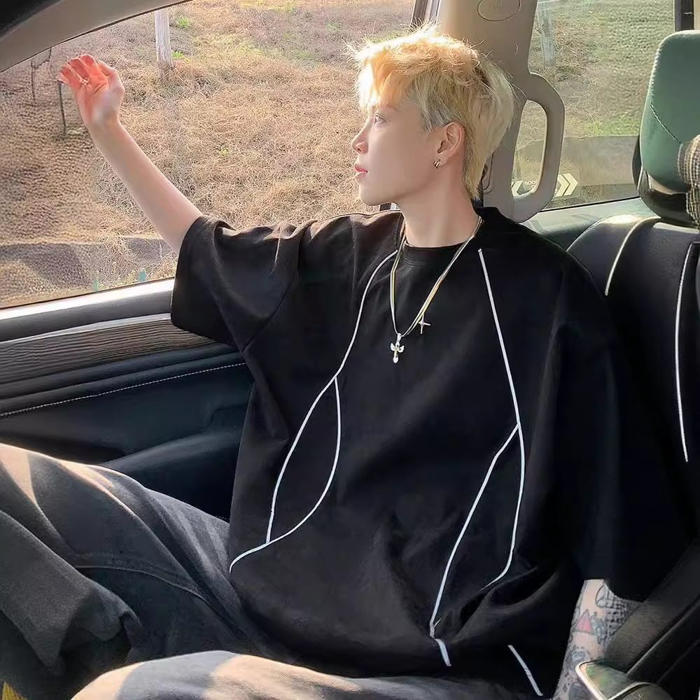 反光条麂皮短袖T恤男潮牌小众个性高街半袖衣服美式复古痞帅体恤