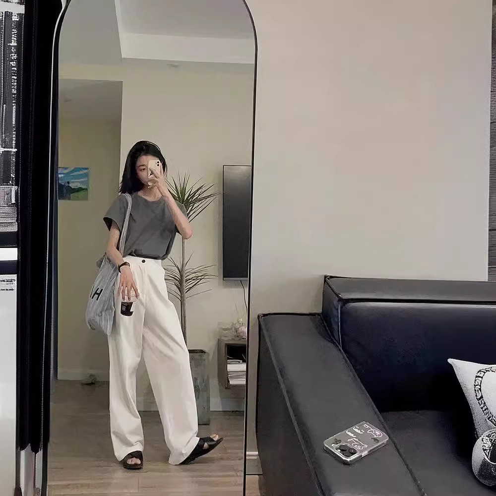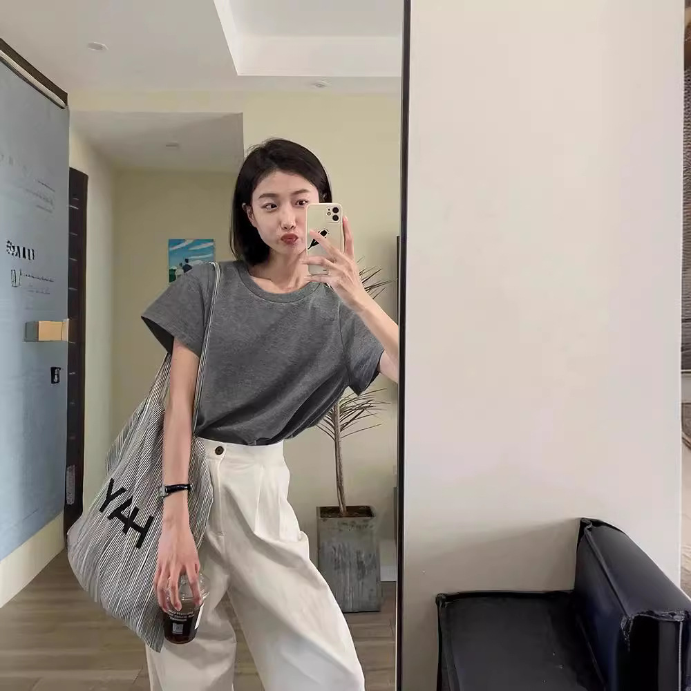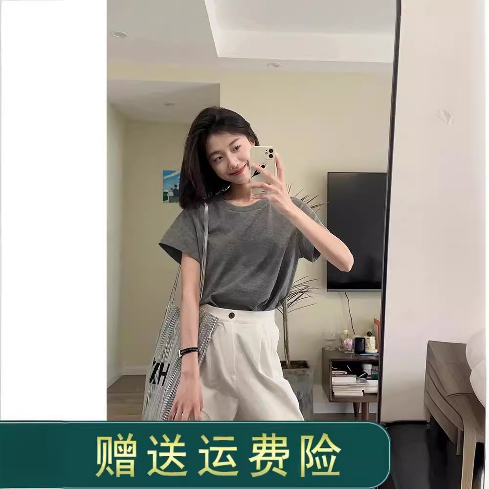 灰色纯棉正肩T恤女上衣夏季简约宽松百搭韩版基础款短袖