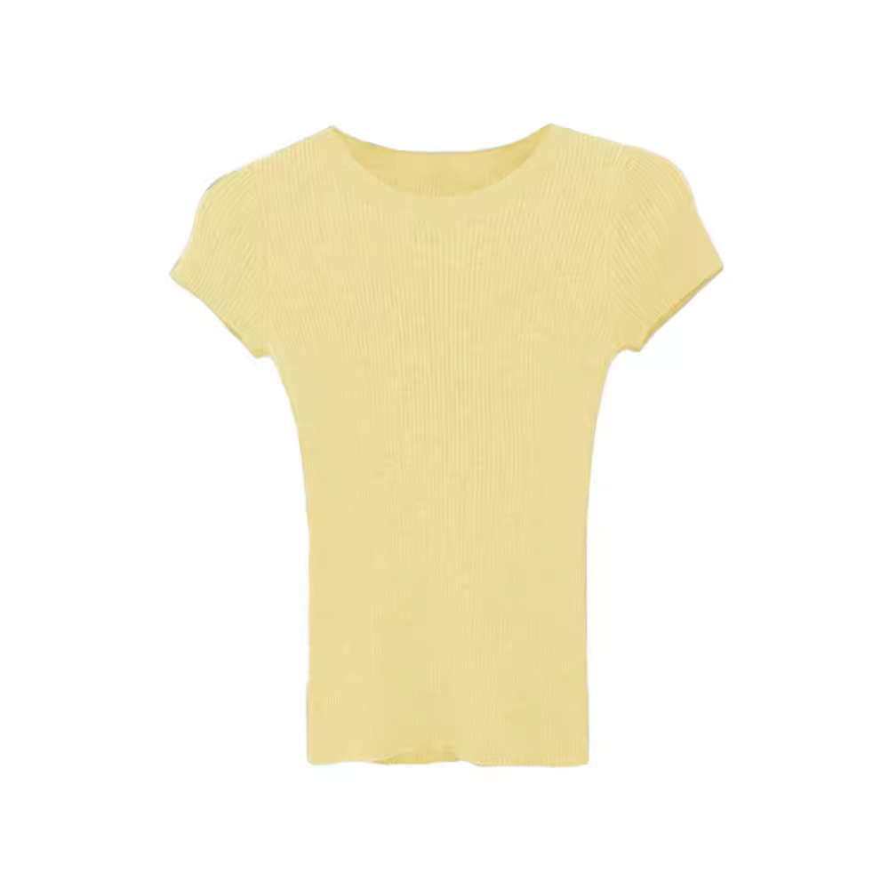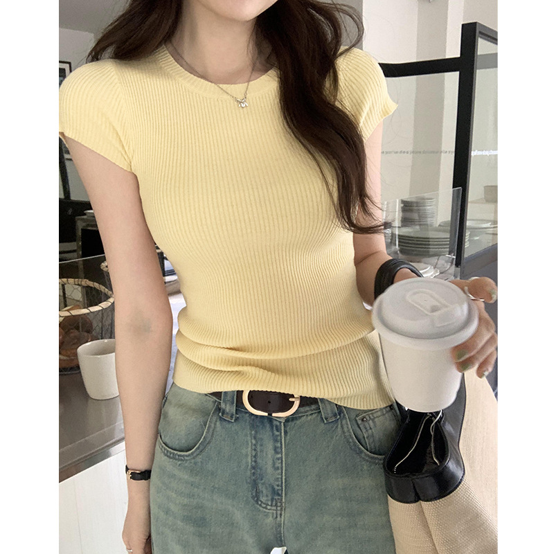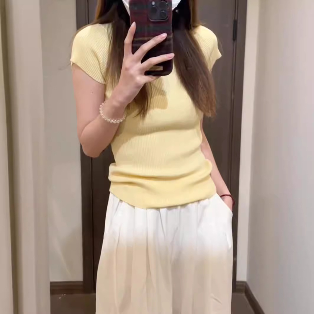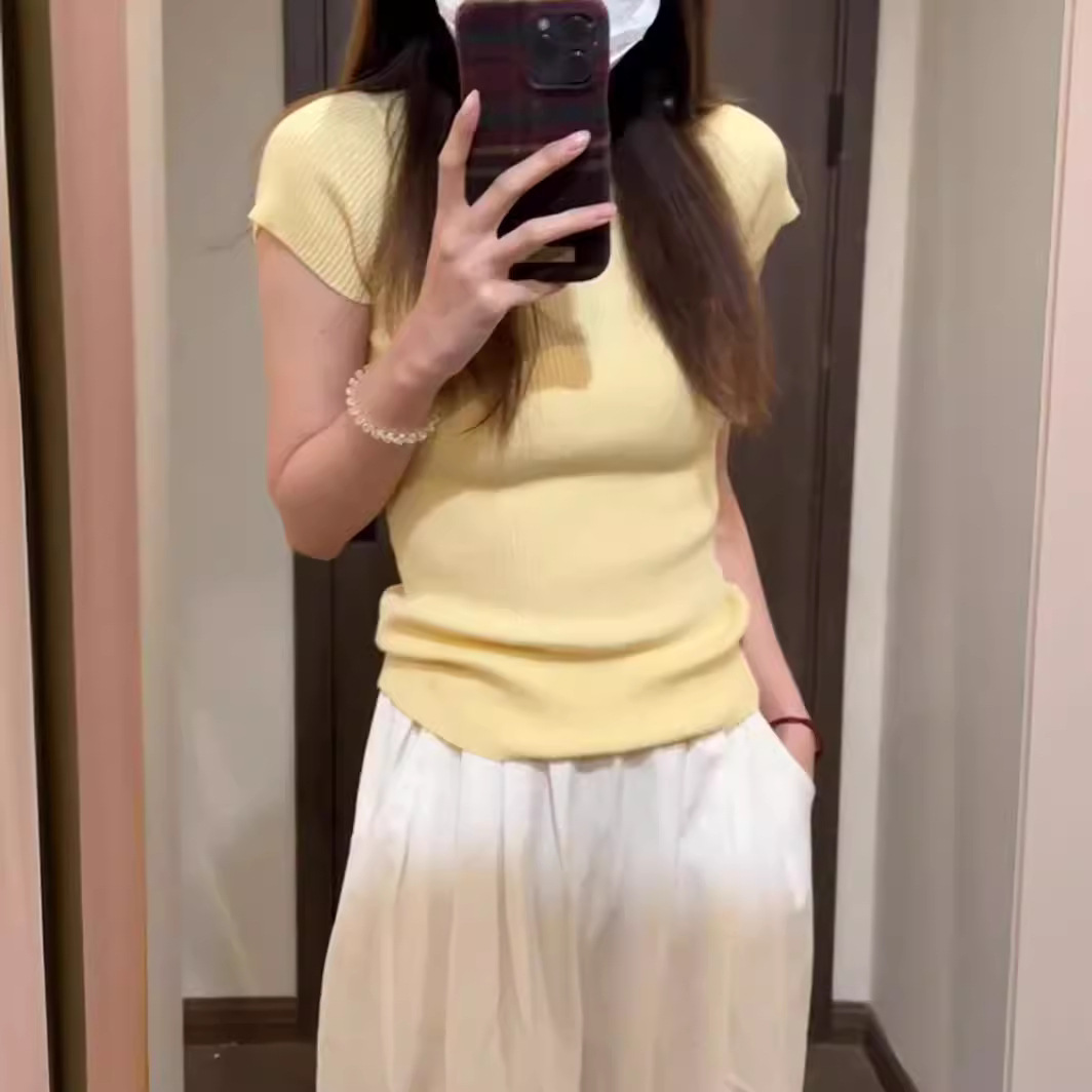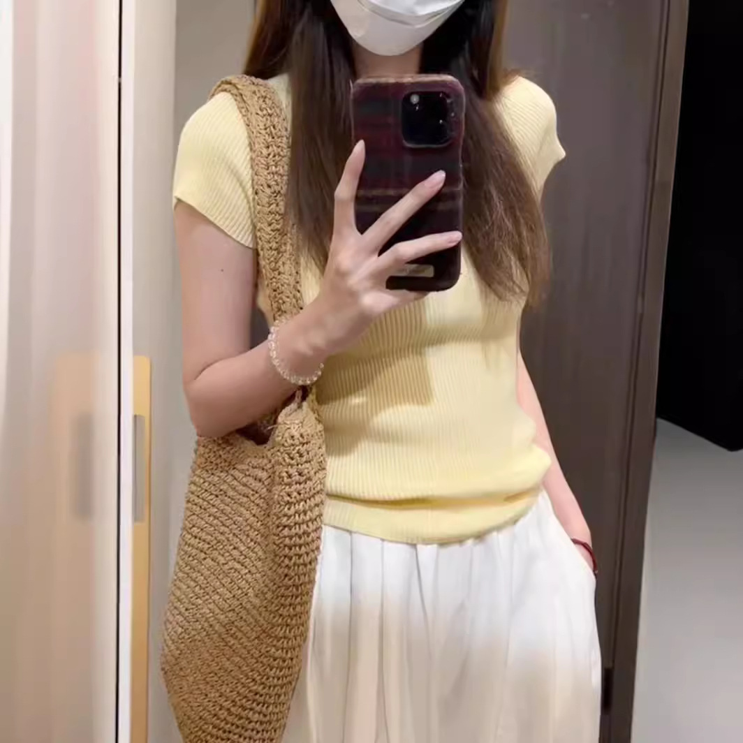 软糯修身鹅黄色针织上衣女春夏季chic小众复古套头短袖T恤潮
