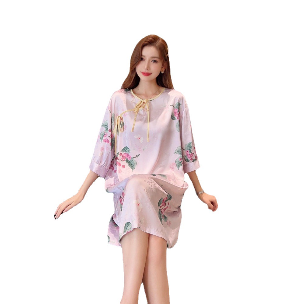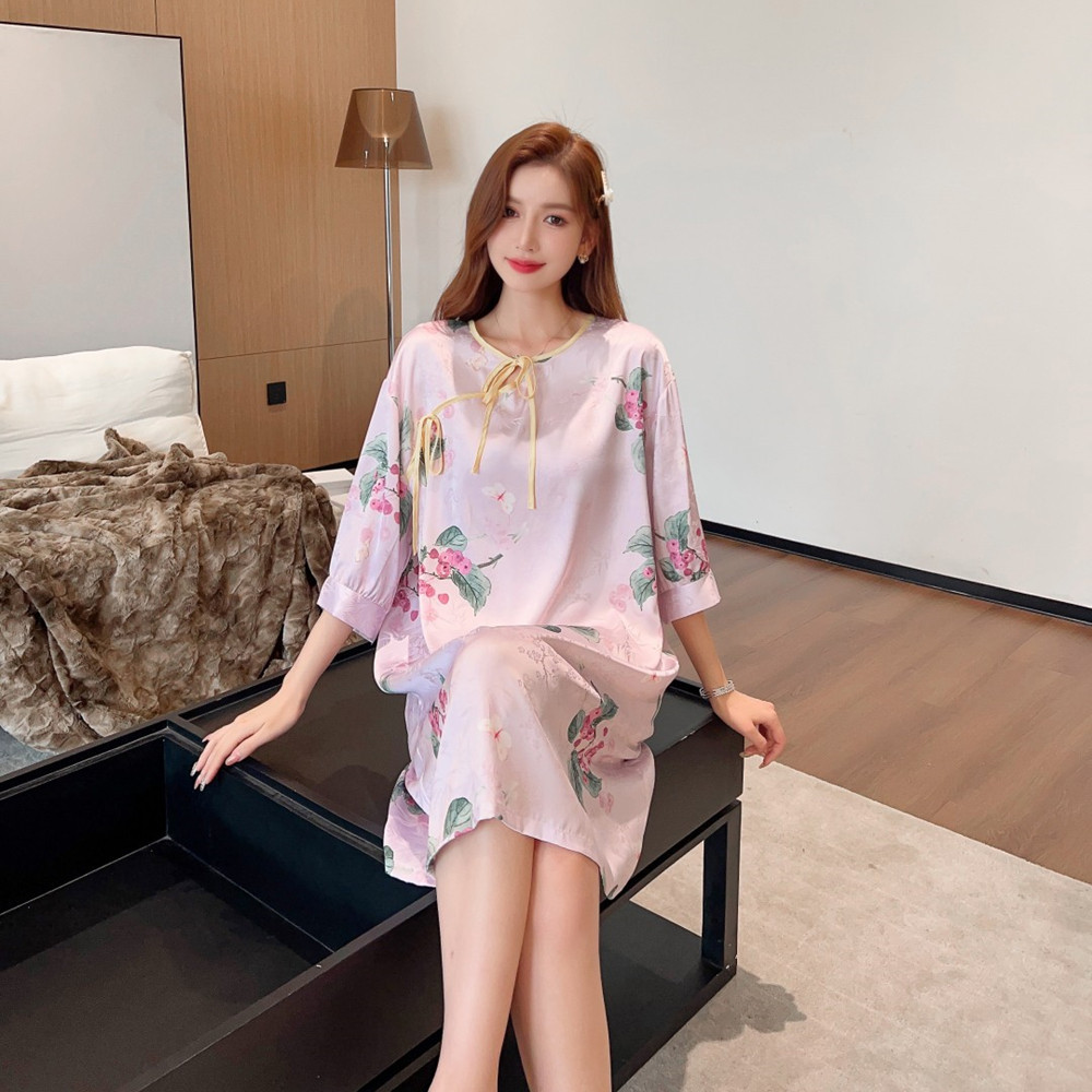 新中式夏睡衣女冰丝圆领花卉国风中长款睡裙缎面提花家居服可外穿