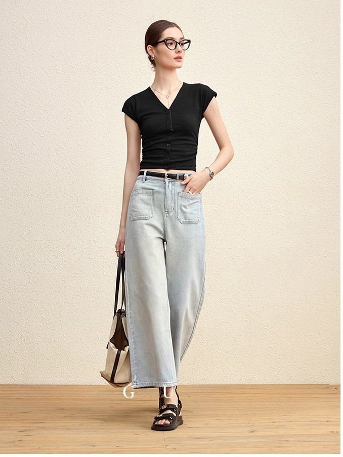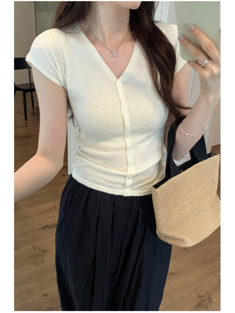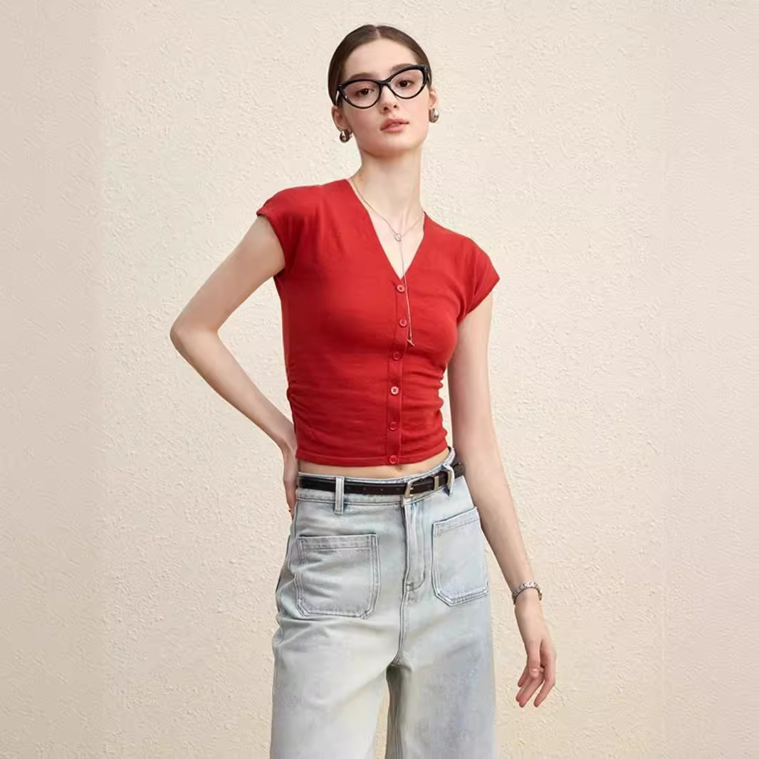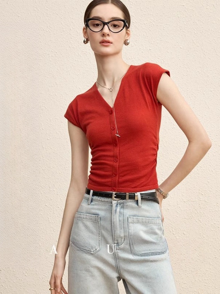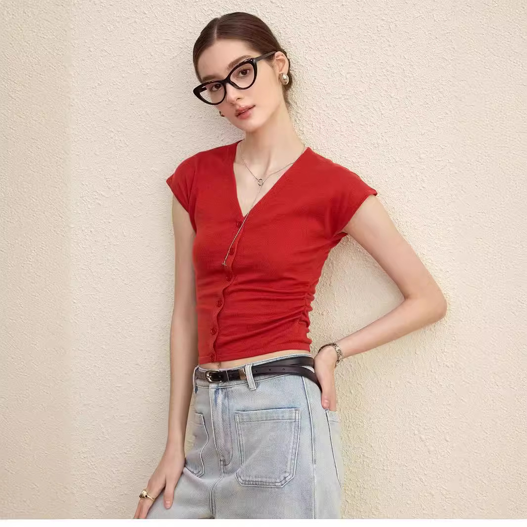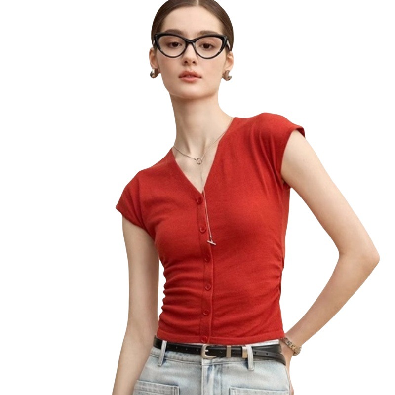 法式修身褶皱V领针织短袖T恤女夏季设计感收腰显瘦纯欲打底衫