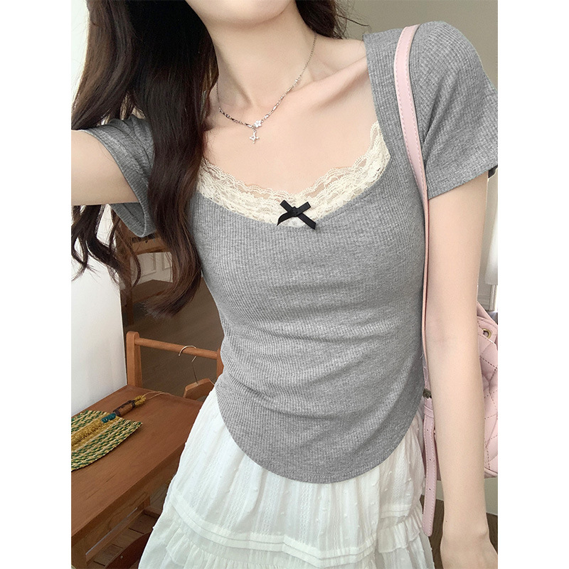 蕾丝拼接方领T恤女夏季蝴蝶结修身纯欲风正肩短袖小众短上衣