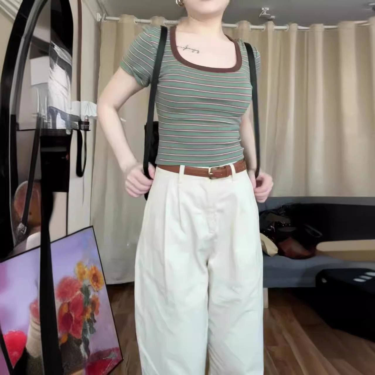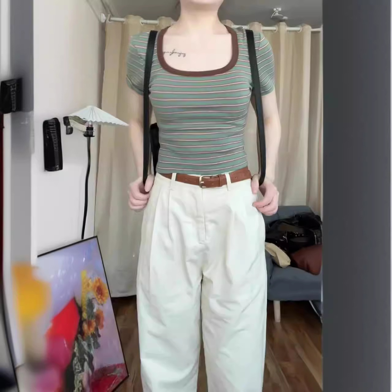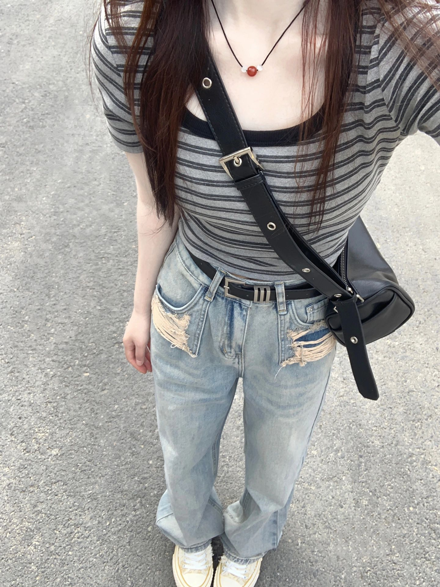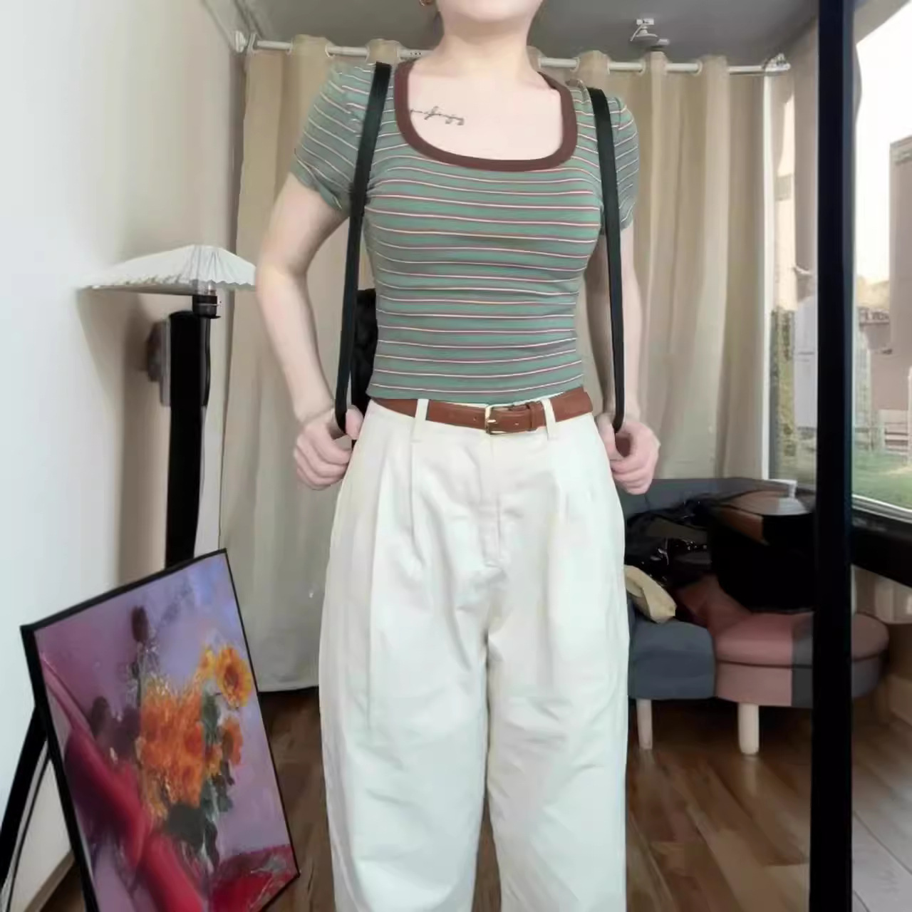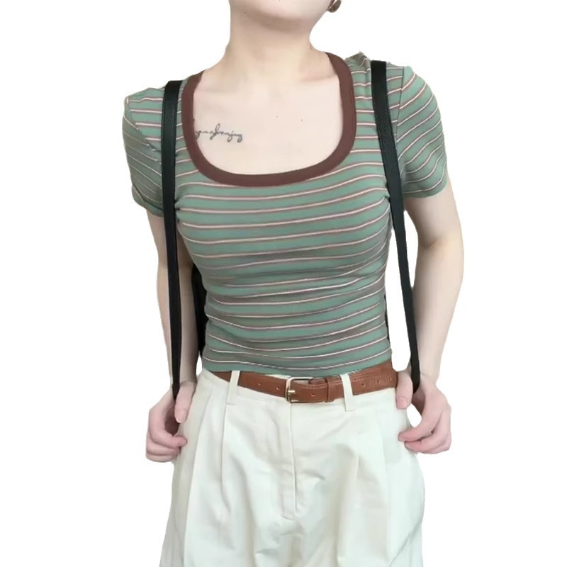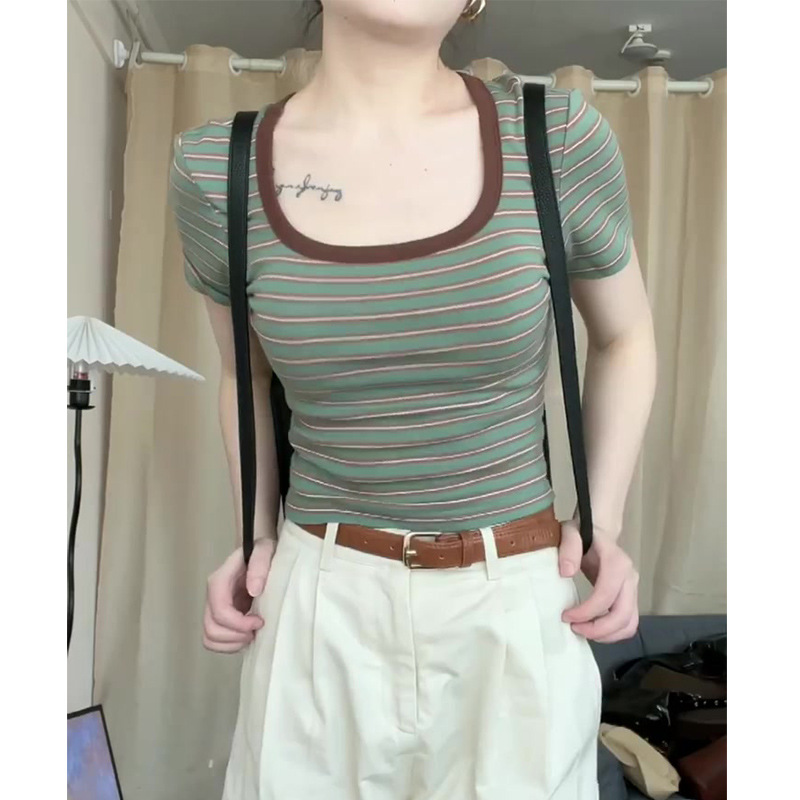 夏季新款港风设计感修身短款方领短袖T恤女简约百搭文艺风