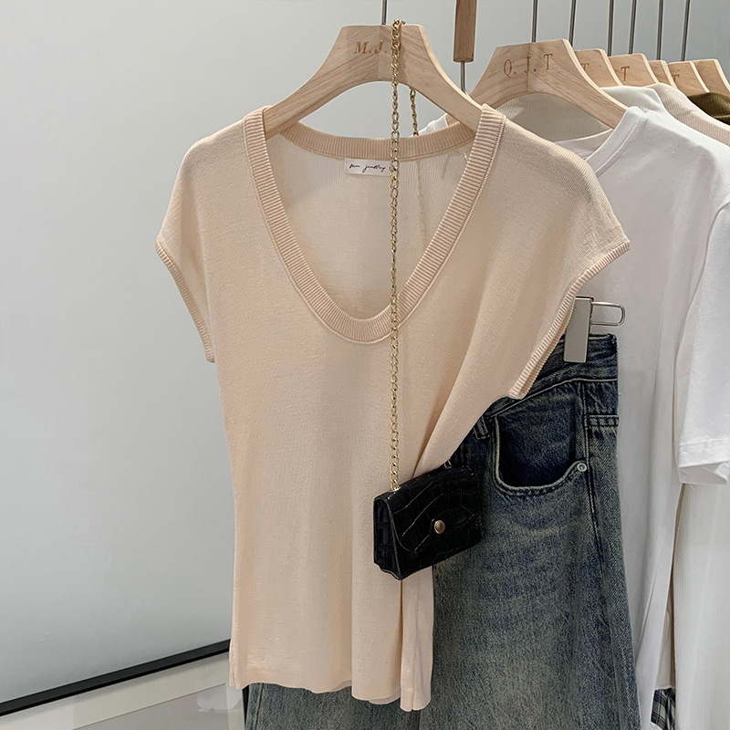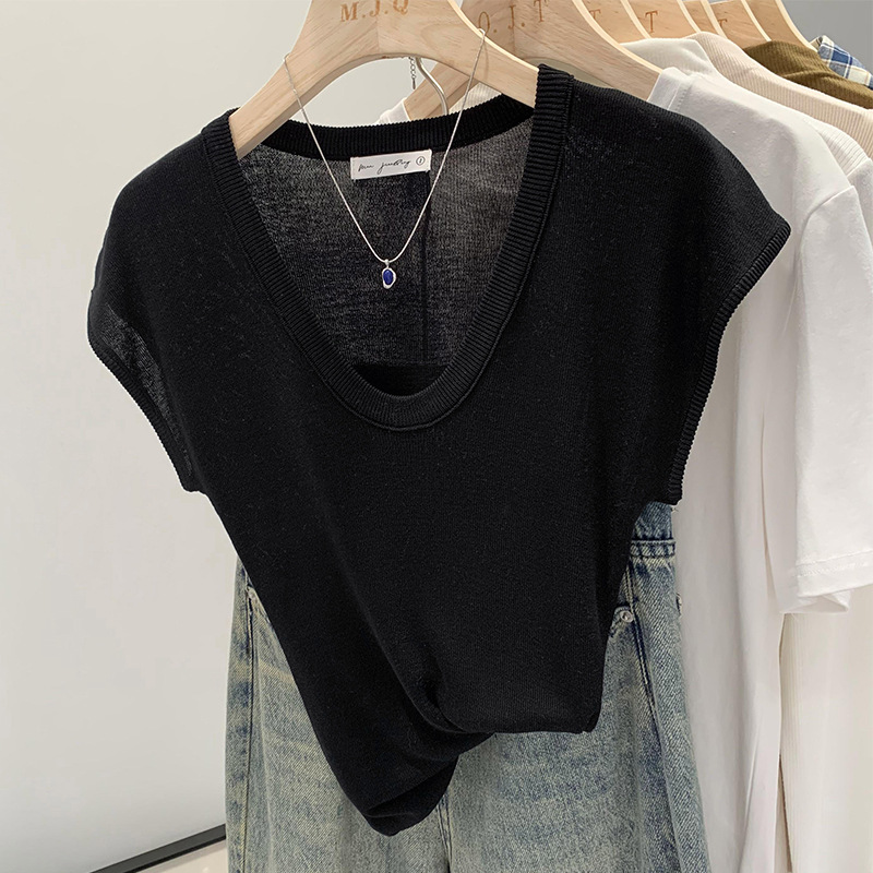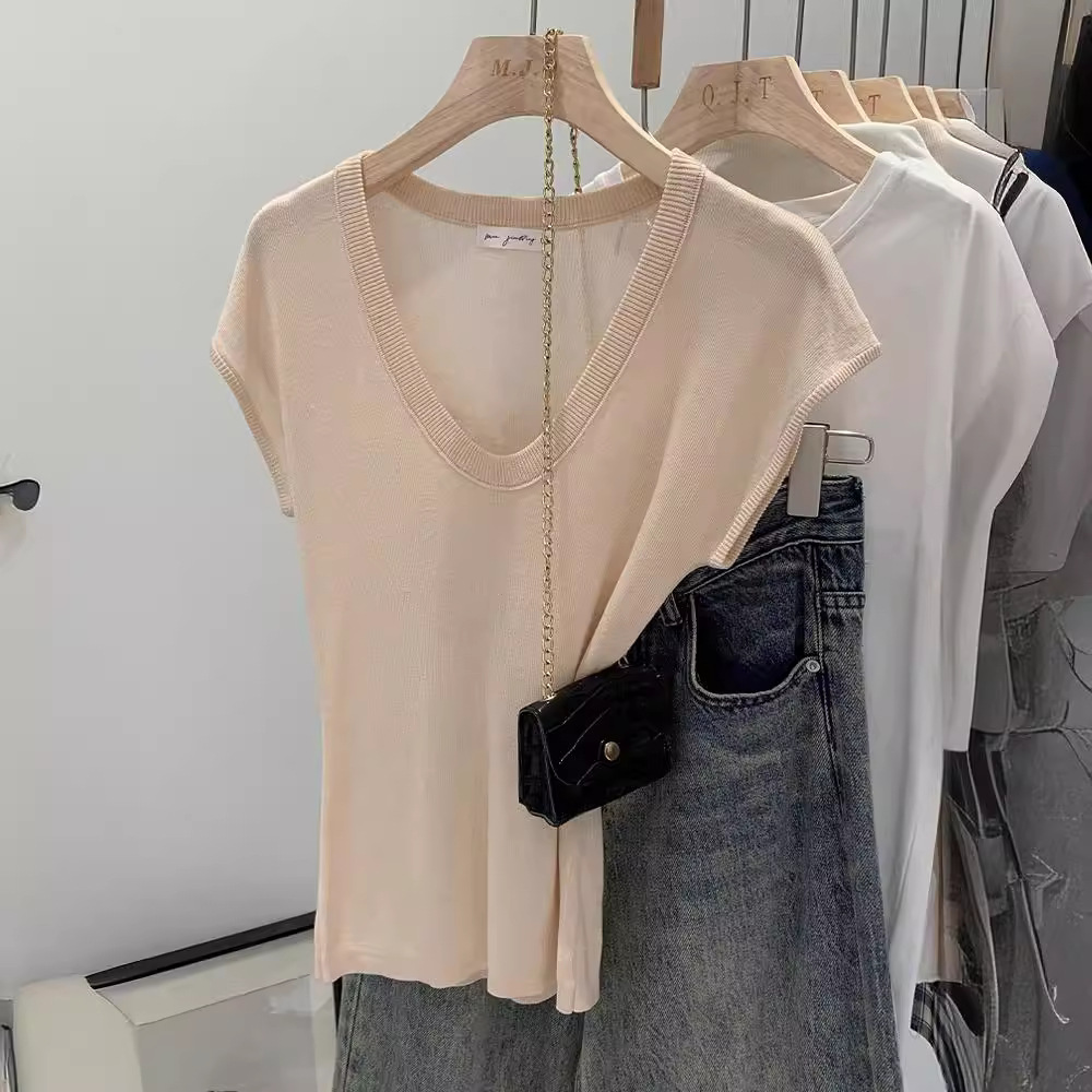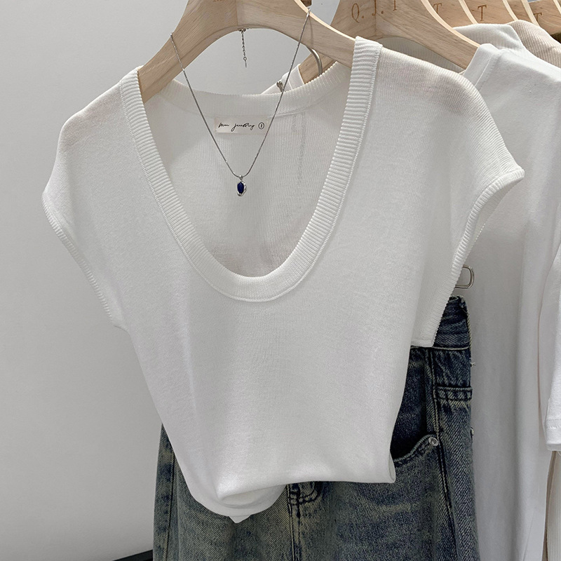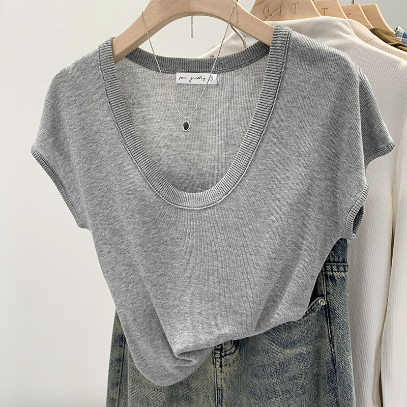 甜辣风U领针织短袖女夏季紧身显瘦松弛感韩版上衣正肩T恤打底