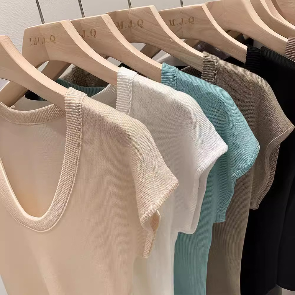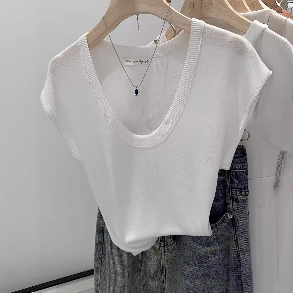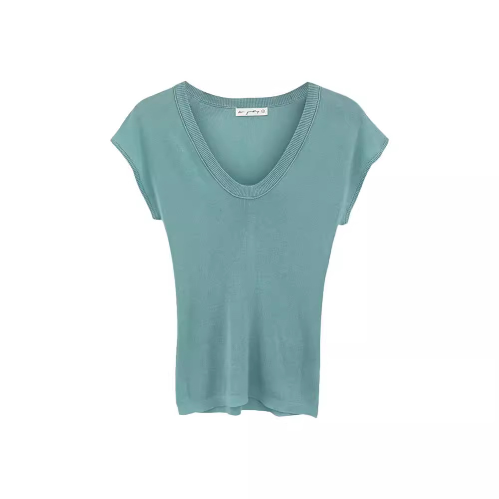 甜辣风U领针织短袖女夏季紧身显瘦松弛感韩版上衣正肩T恤打底