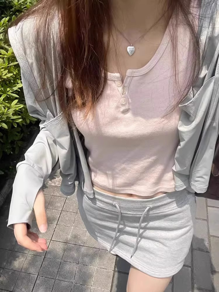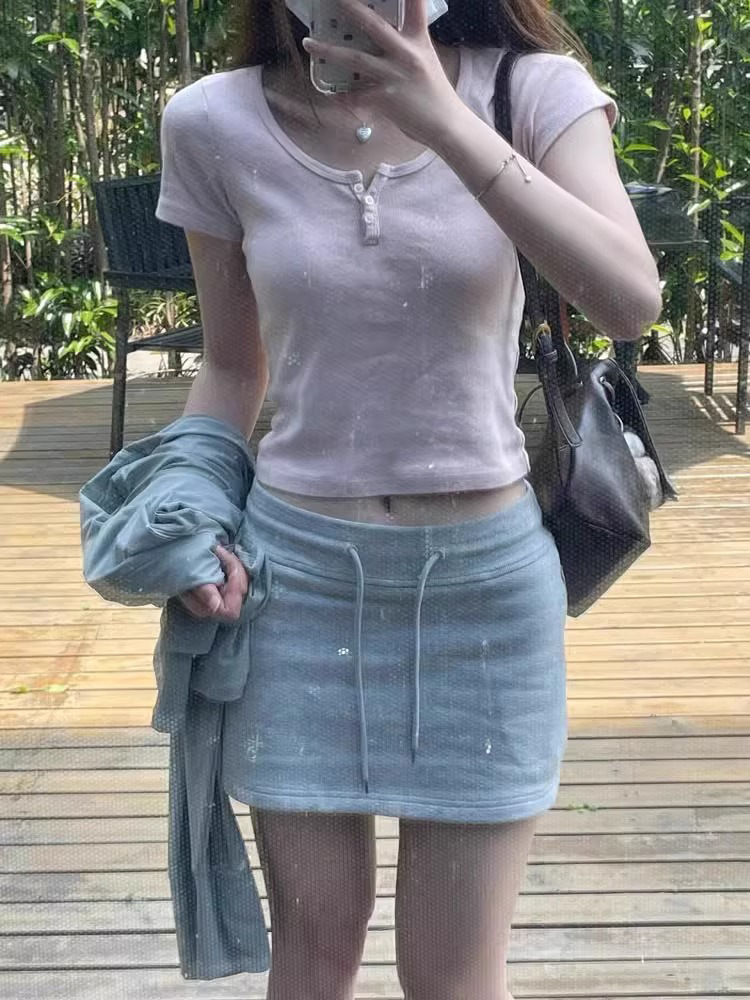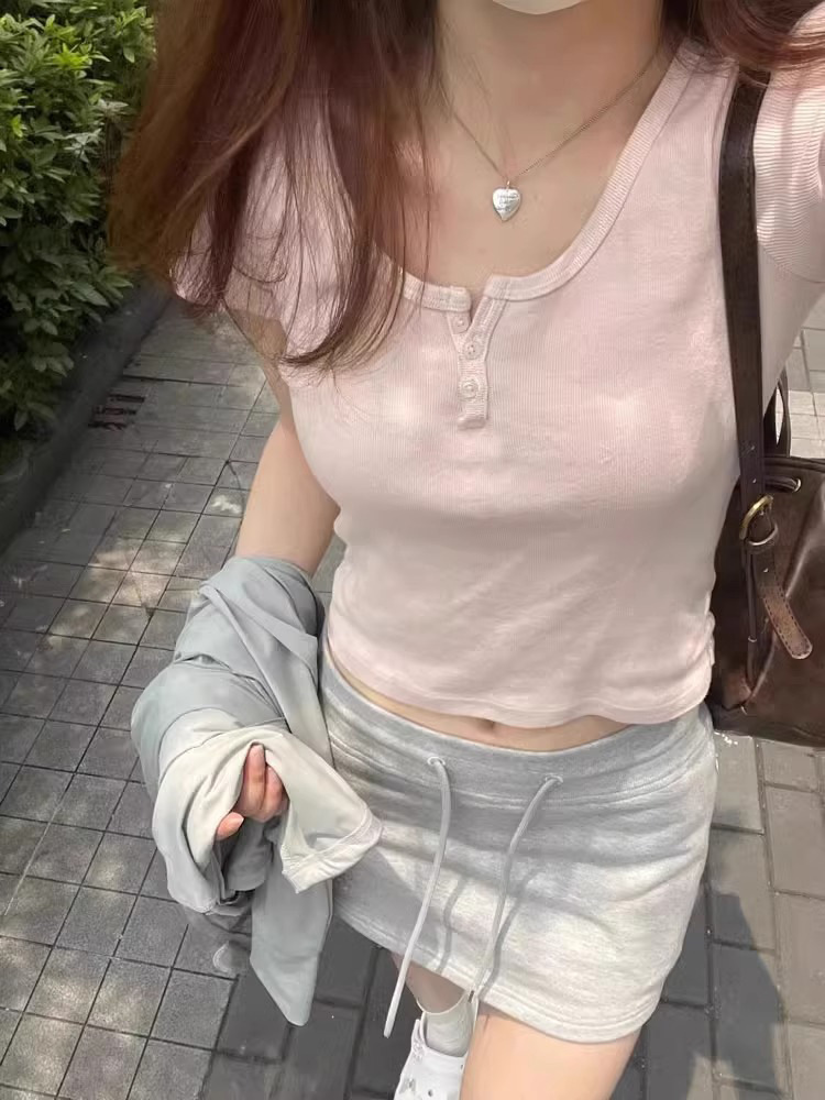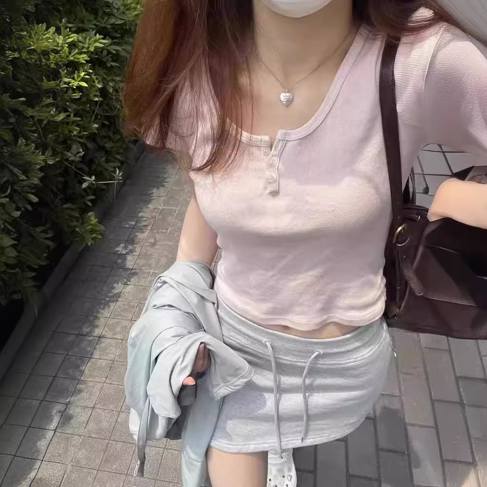 纯欲风U领纽扣短袖女夏季新款修身显瘦短上衣百搭温柔粉色T恤