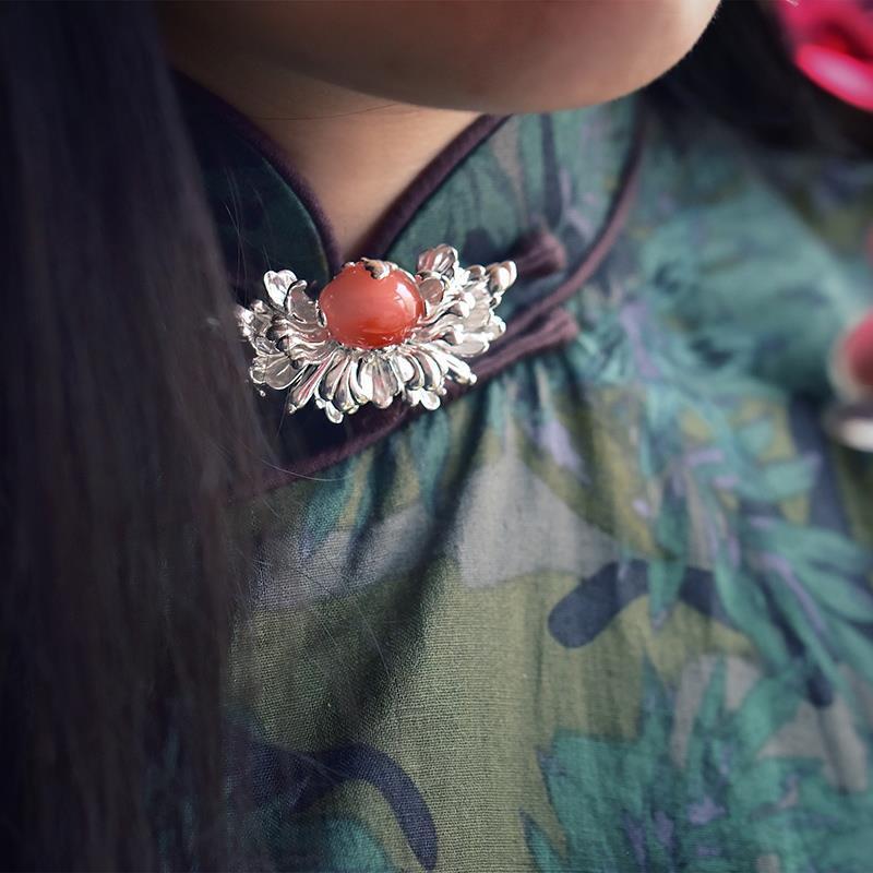 新款民族风设计纯银胸针个性古典旗袍扣镀白金色丝巾扣高档女奢华