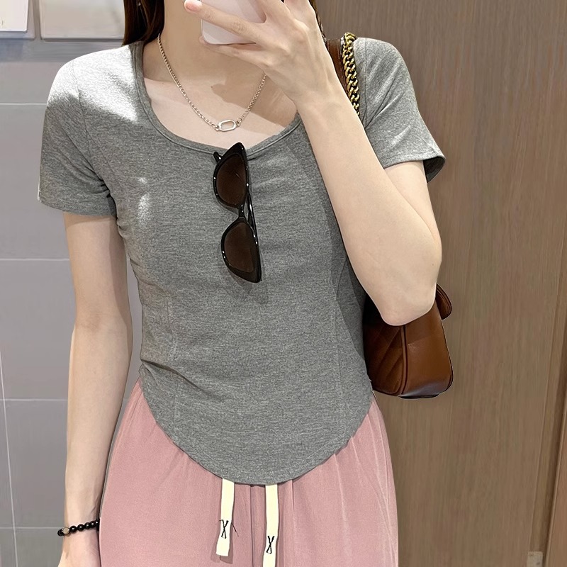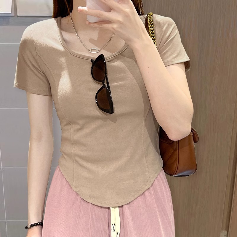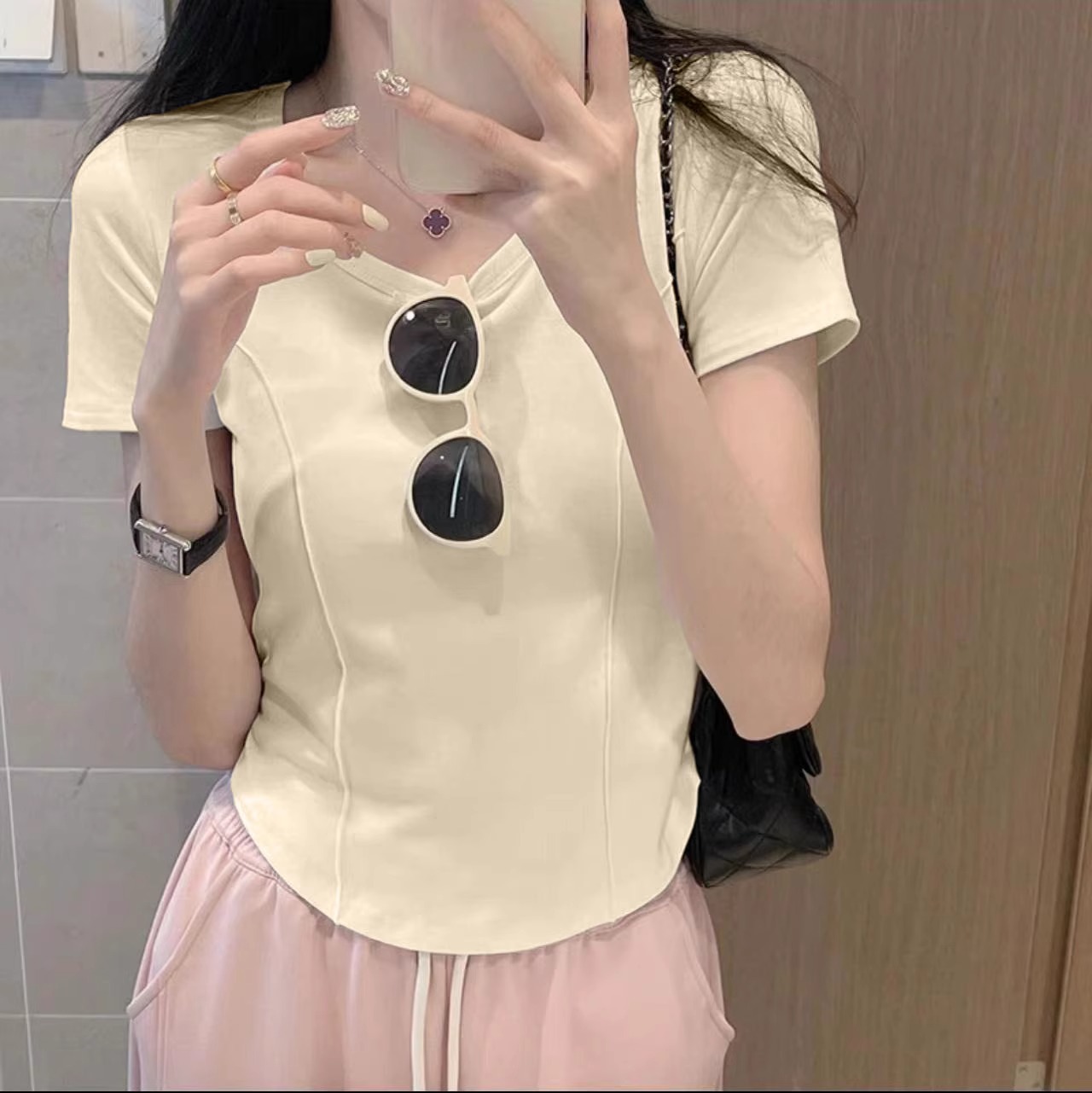 奶杏色正肩短袖夏修身纯欲设计感鱼骨方领锁骨t恤女上衣