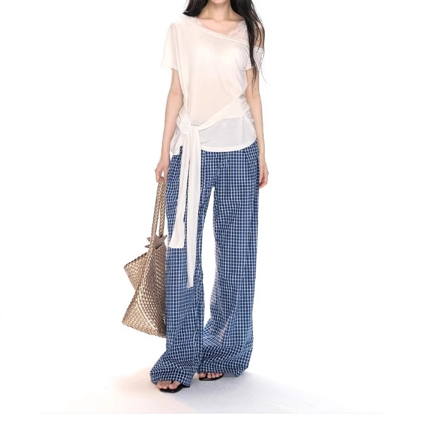 新款网纱莱赛尔短袖T恤三色斜肩上衣打底衫女
