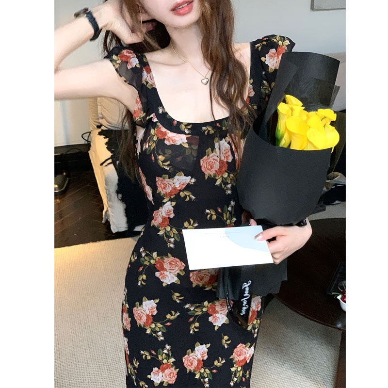 新品黑色小飞袖修身碎花裙女夏季裙子度假风法式复古连衣裙女