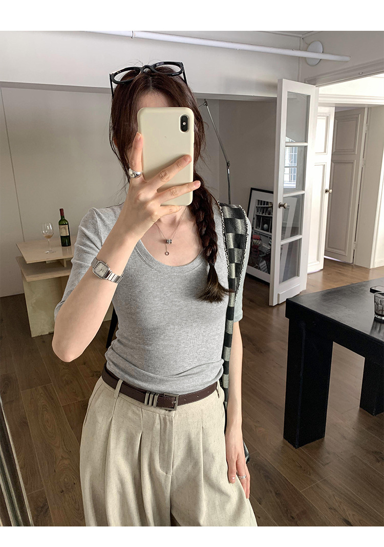 螺纹U领中袖女夏季新款辣妹纯欲风低圆领T恤纯色修身显瘦上衣