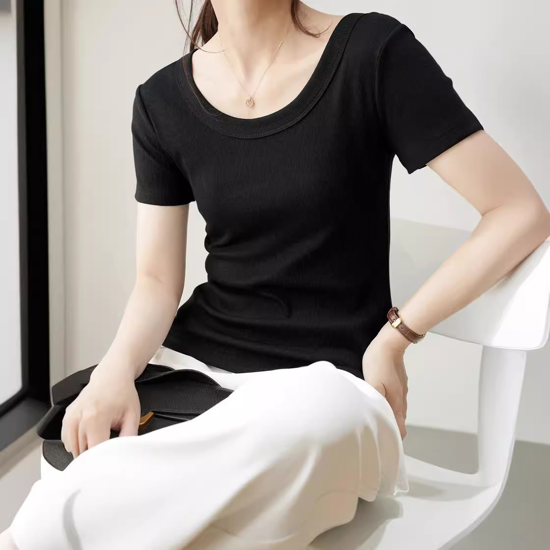 木纤维女士螺纹棉修身T恤大圆领显瘦短袖 夏款女U领上衣
