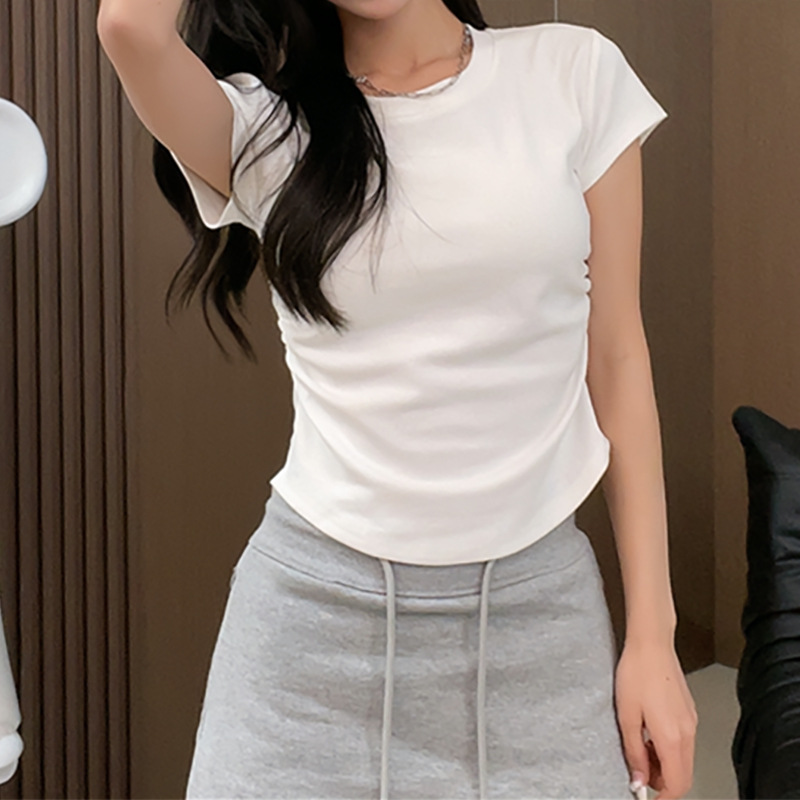 收腰抽褶辣妹t恤女上衣夏季短款小个子正肩显瘦灰色短袖