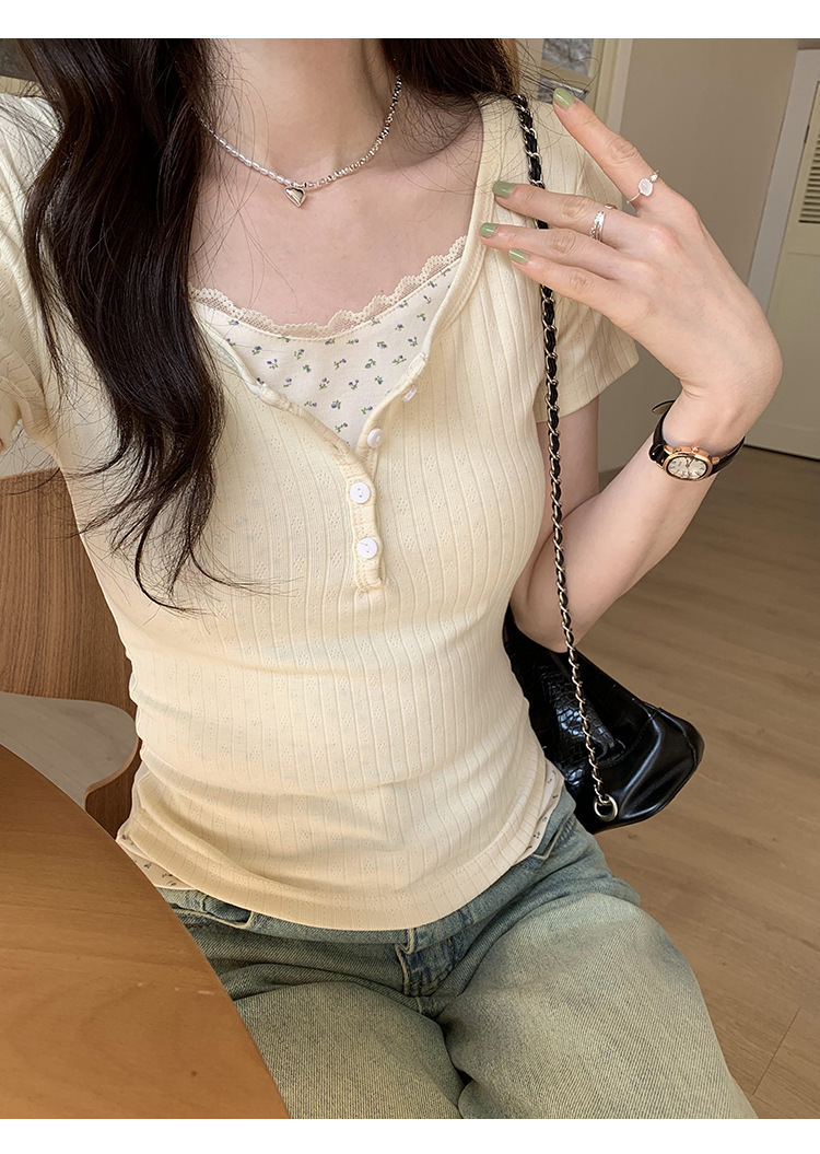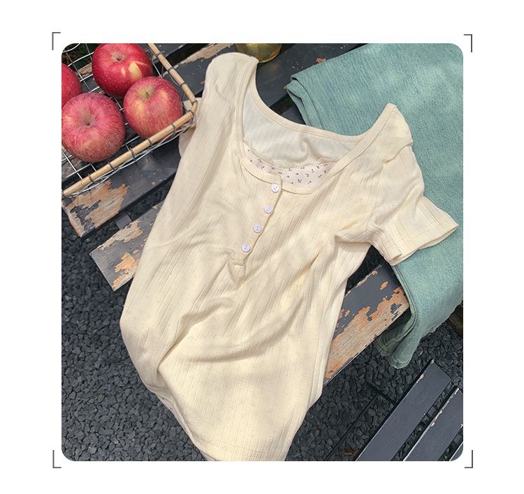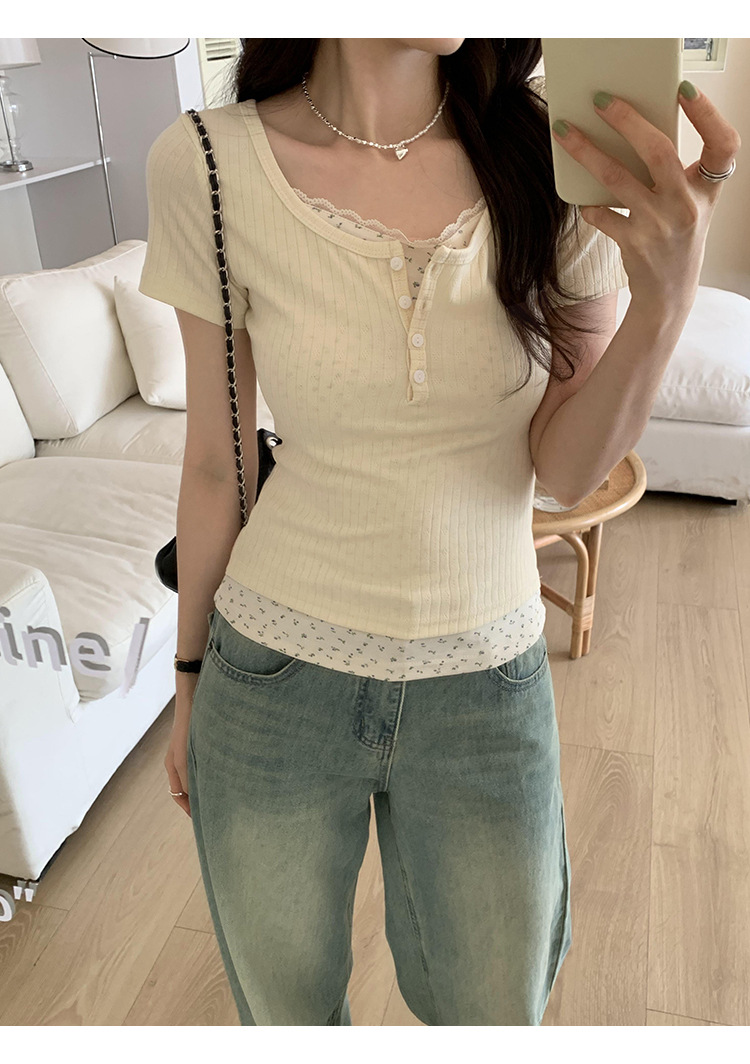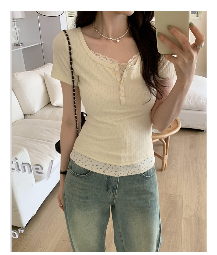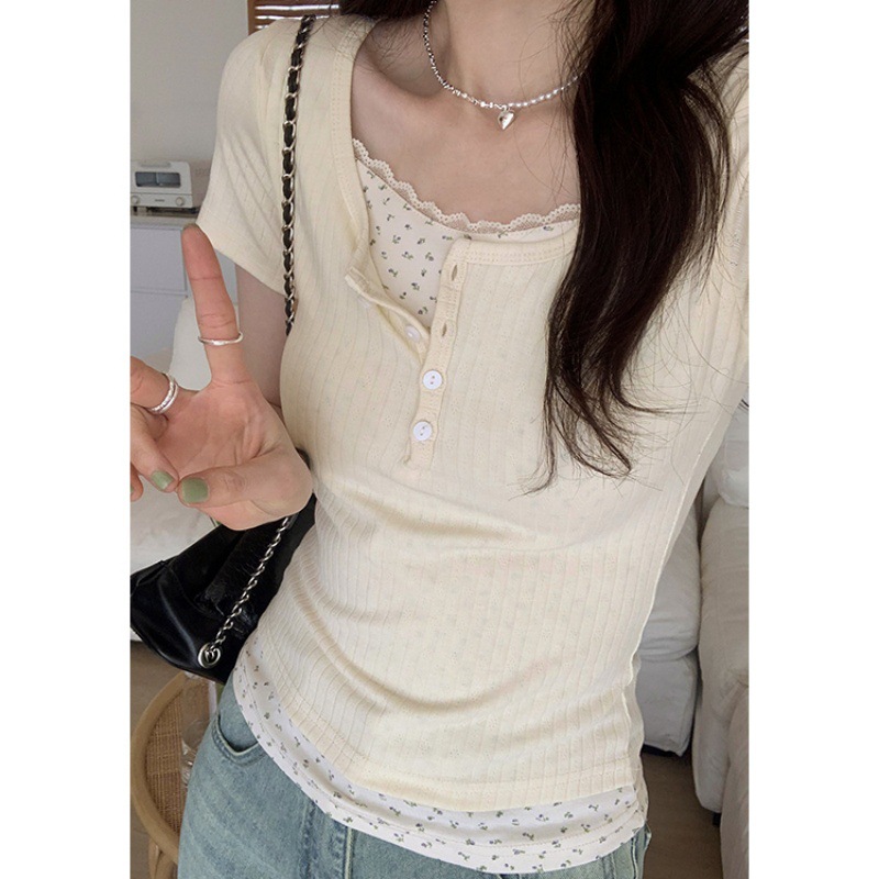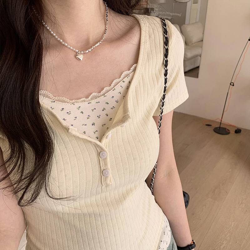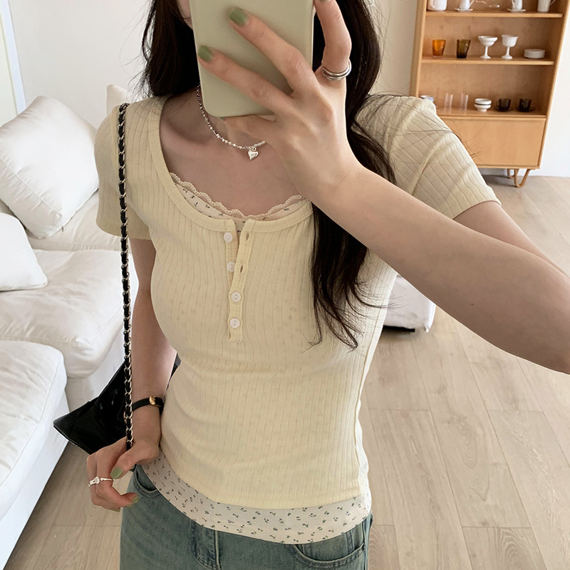 纯欲bm纽扣假两件上衣女夏季修身甜辣风短袖蕾丝拼接正肩T恤