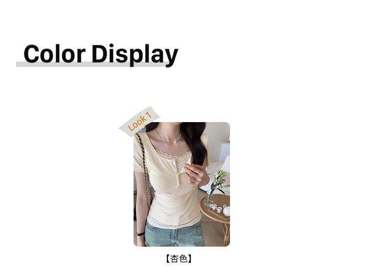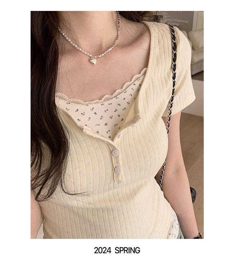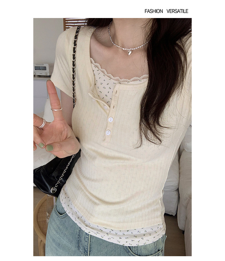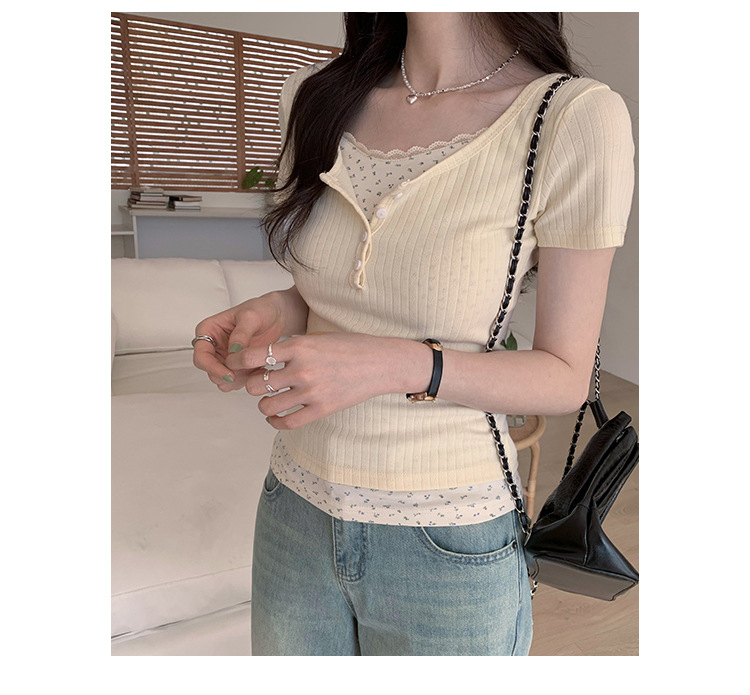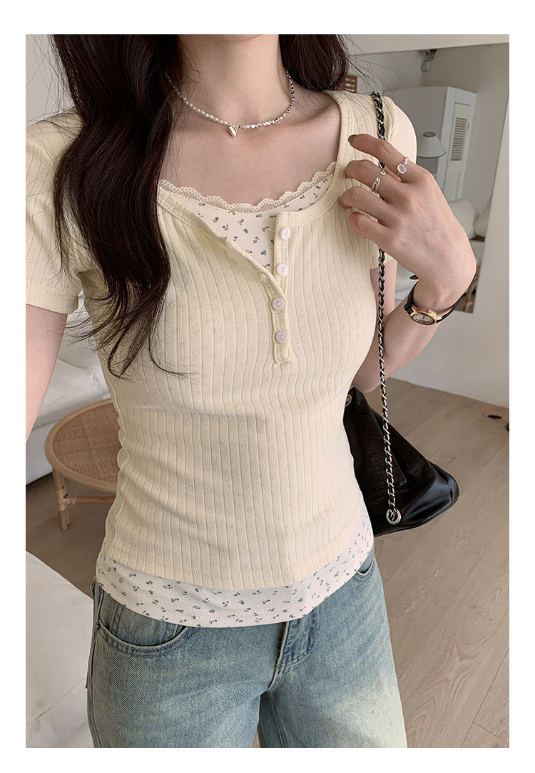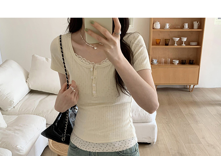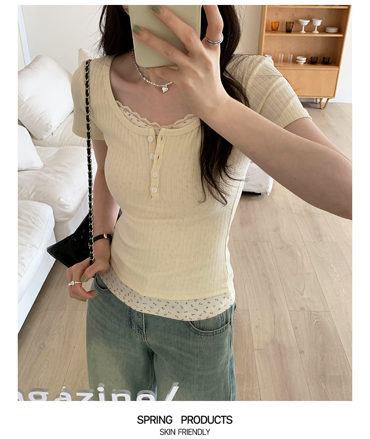 纯欲bm纽扣假两件上衣女夏季修身甜辣风短袖蕾丝拼接正肩T恤