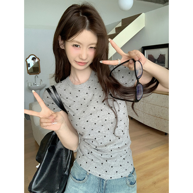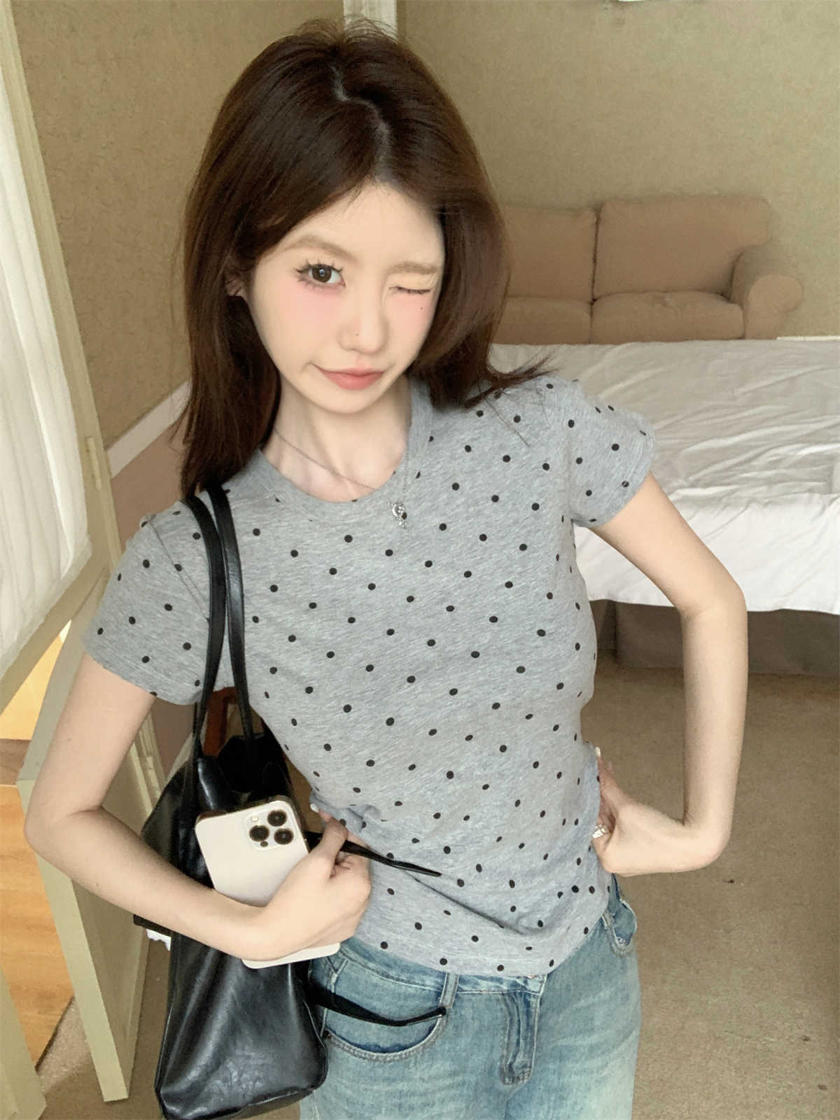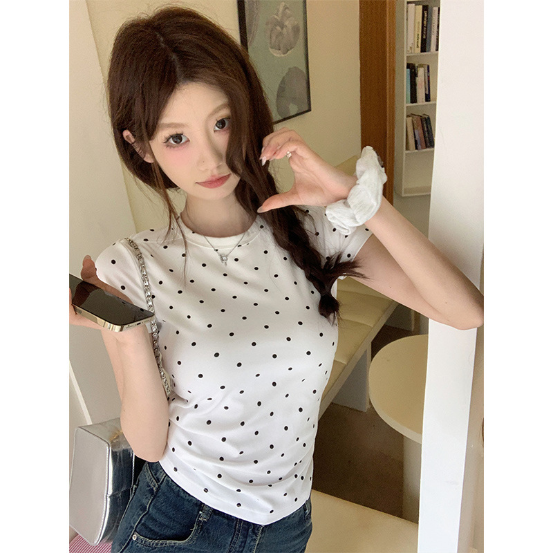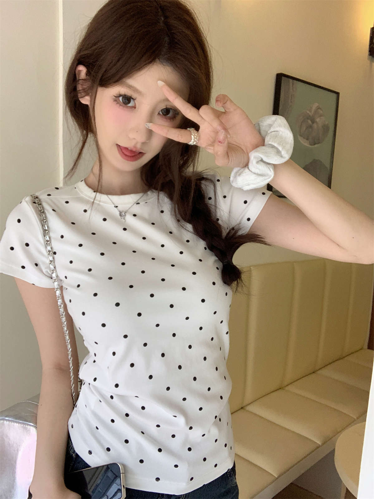 圆领撞色波点短袖女夏季正肩纯棉T恤修身显瘦甜辣风上衣