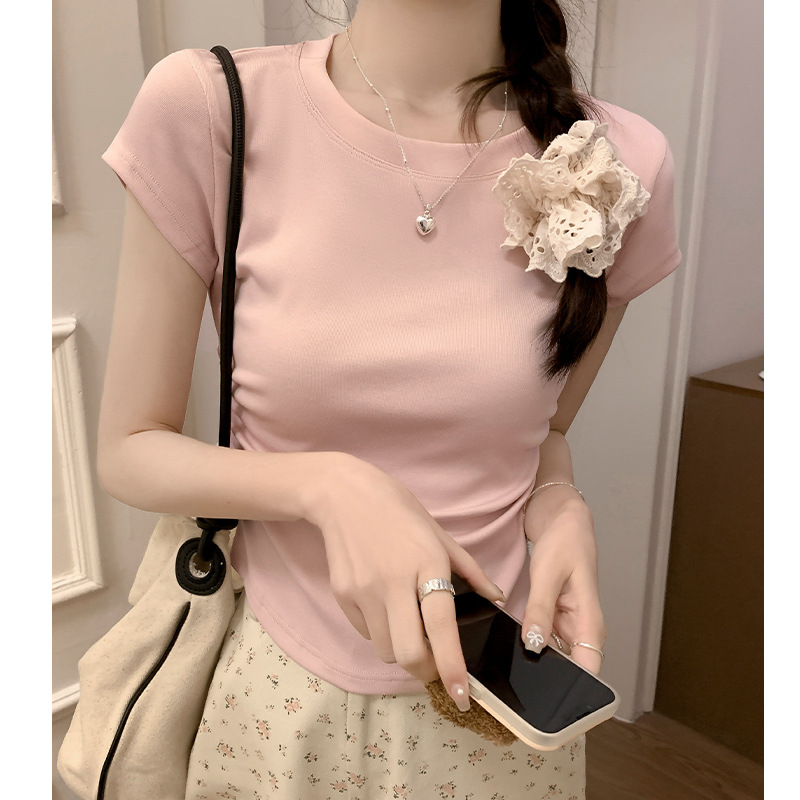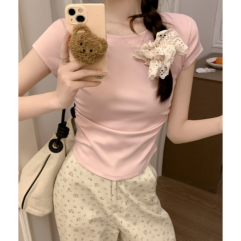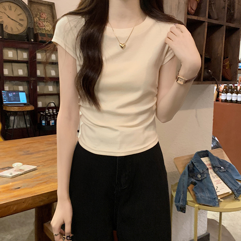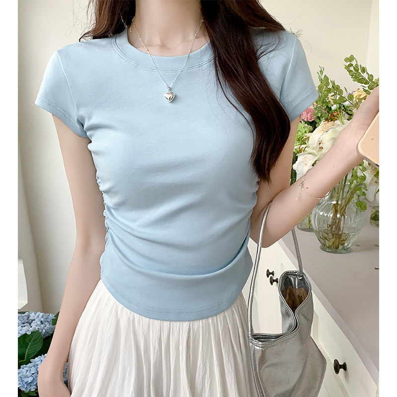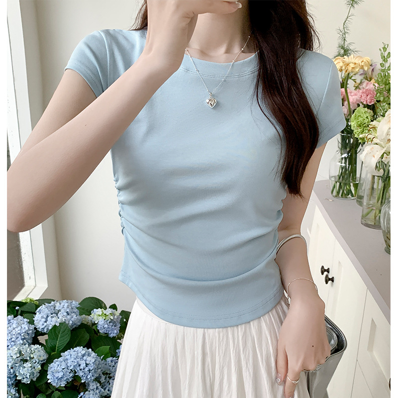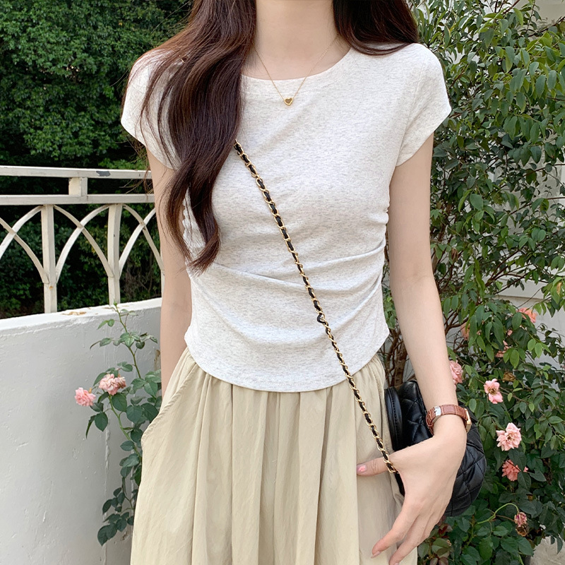 不规则正肩短袖女夏季甜美减龄ins短款上衣修身百搭抽褶设计感T恤