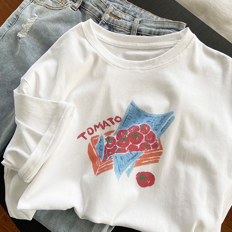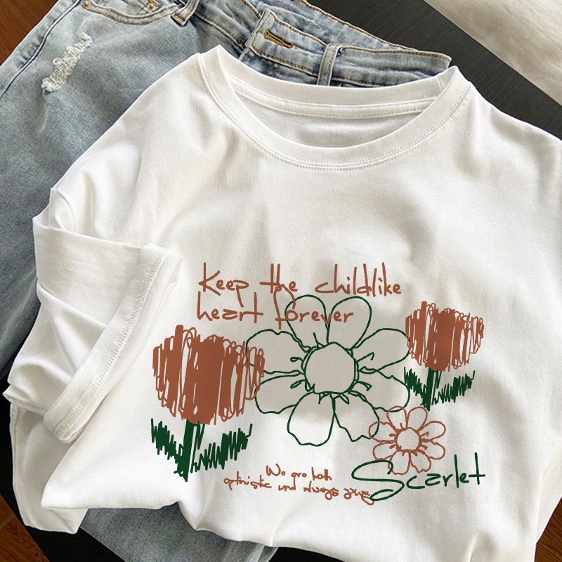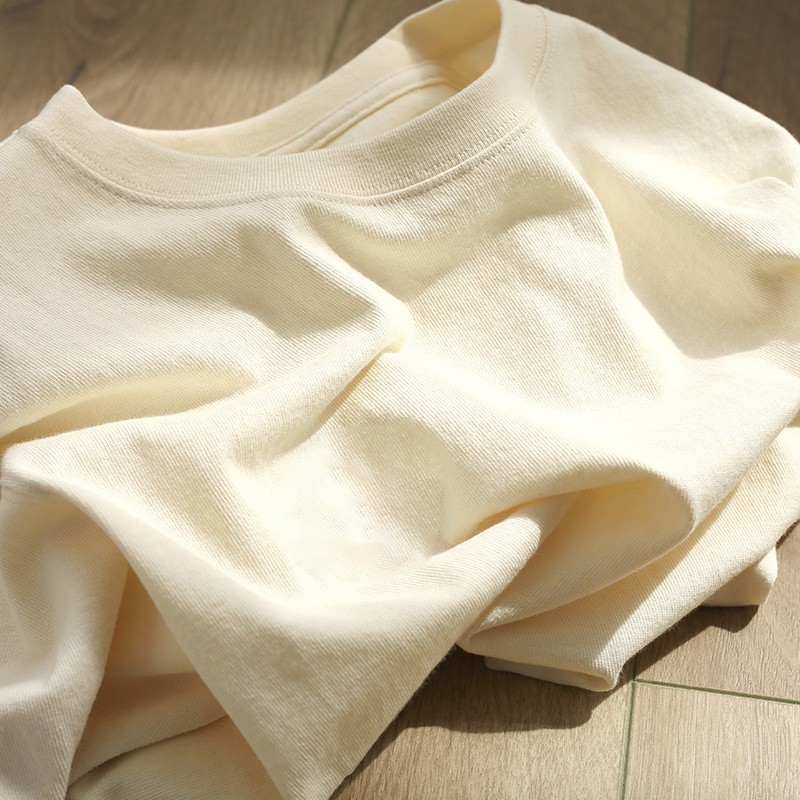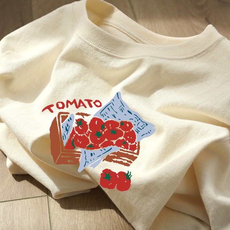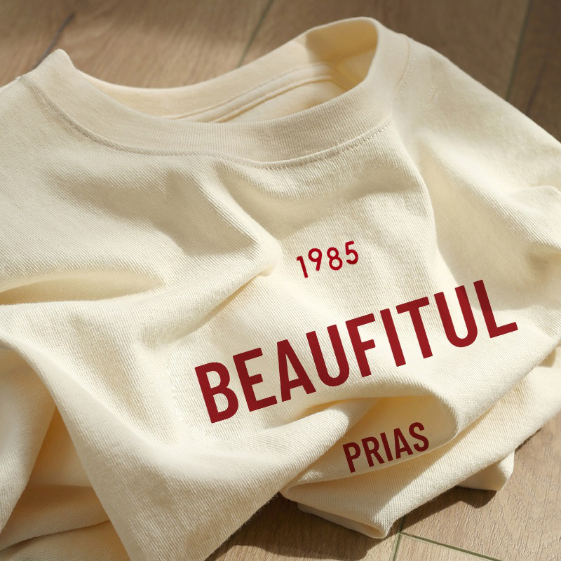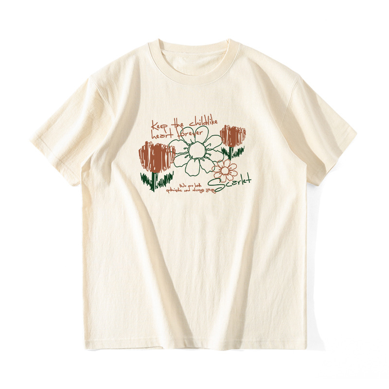 奶杏色印花短袖女夏季重磅纯棉上衣大码宽松半袖百搭学生T恤