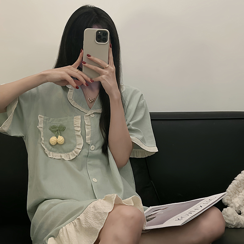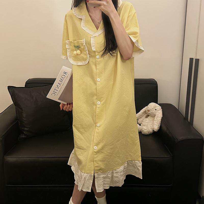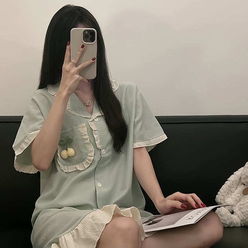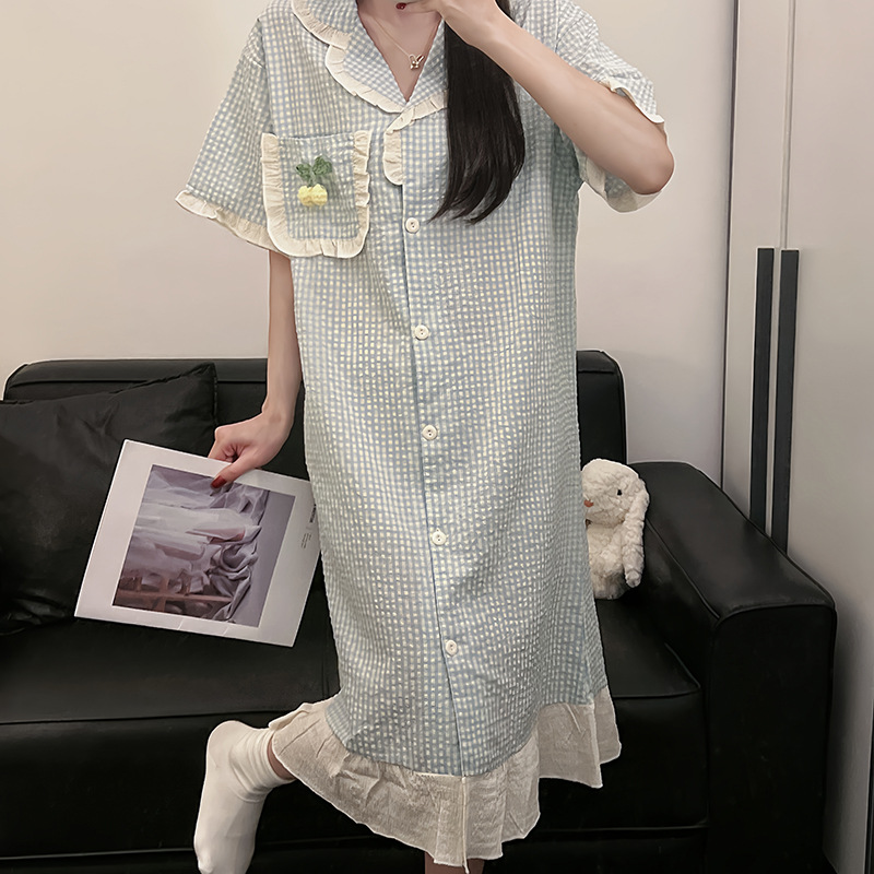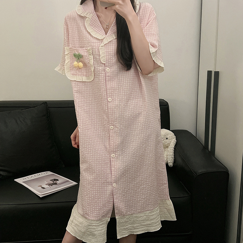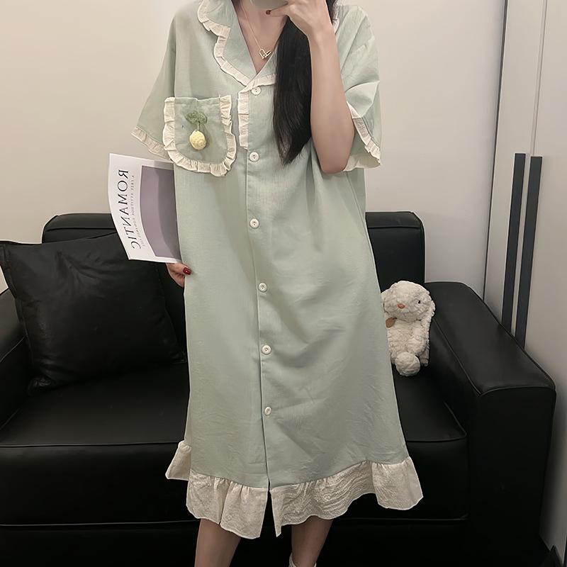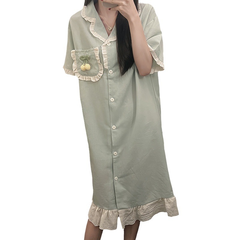 五分袖日系连体睡裙女年夏季甜美清新睡衣薄款梭织花边家居服