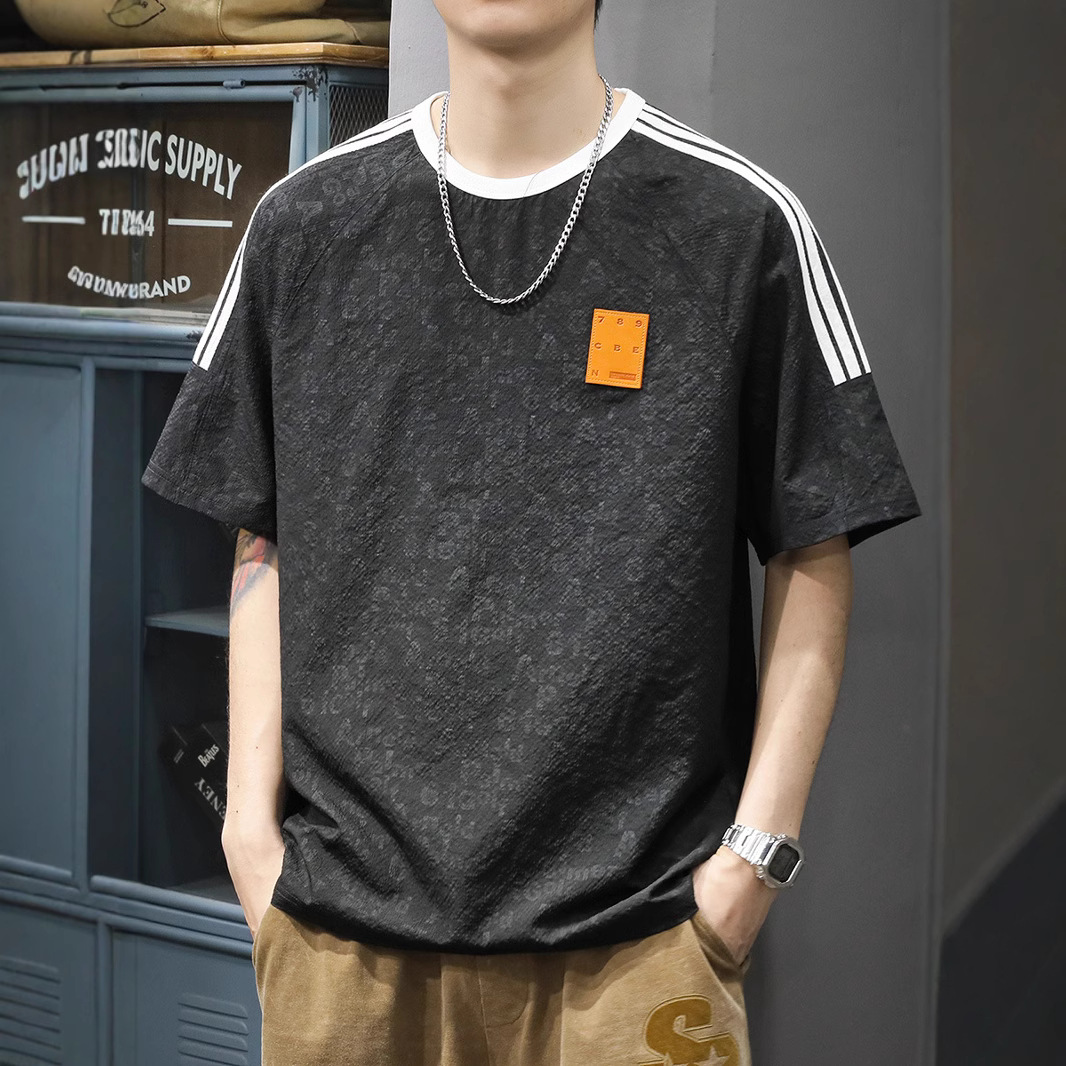 夏季新款条纹冰丝短袖t恤男美式休闲宽松大码半袖2025运动体恤潮T