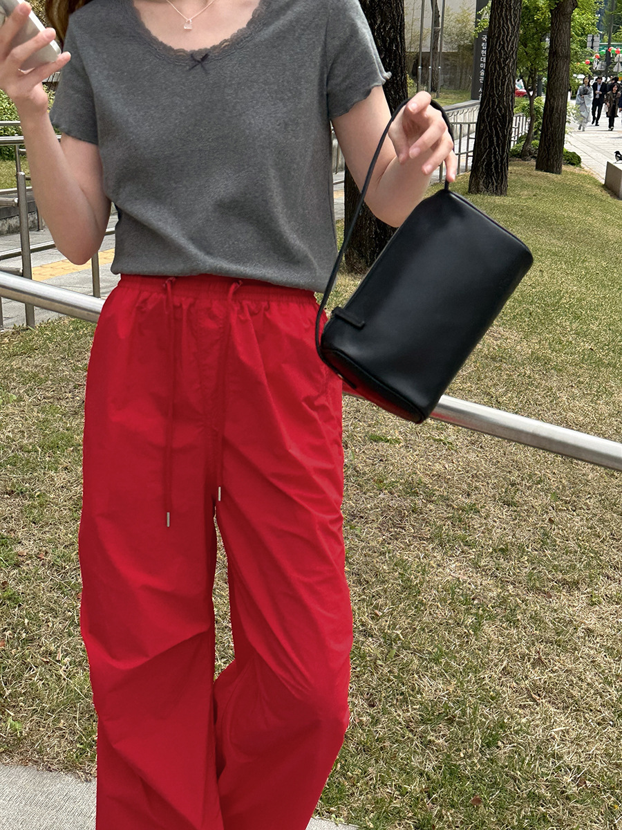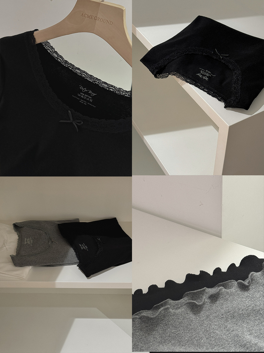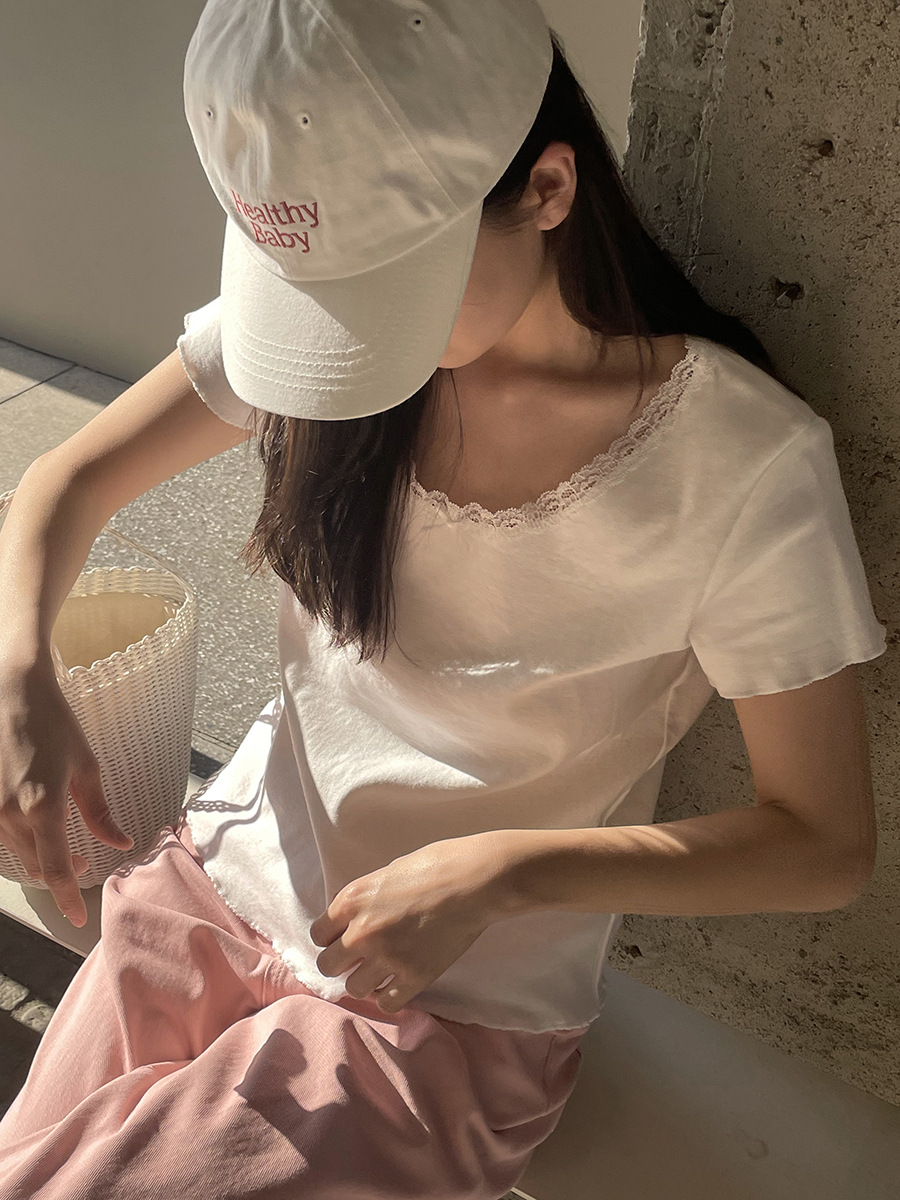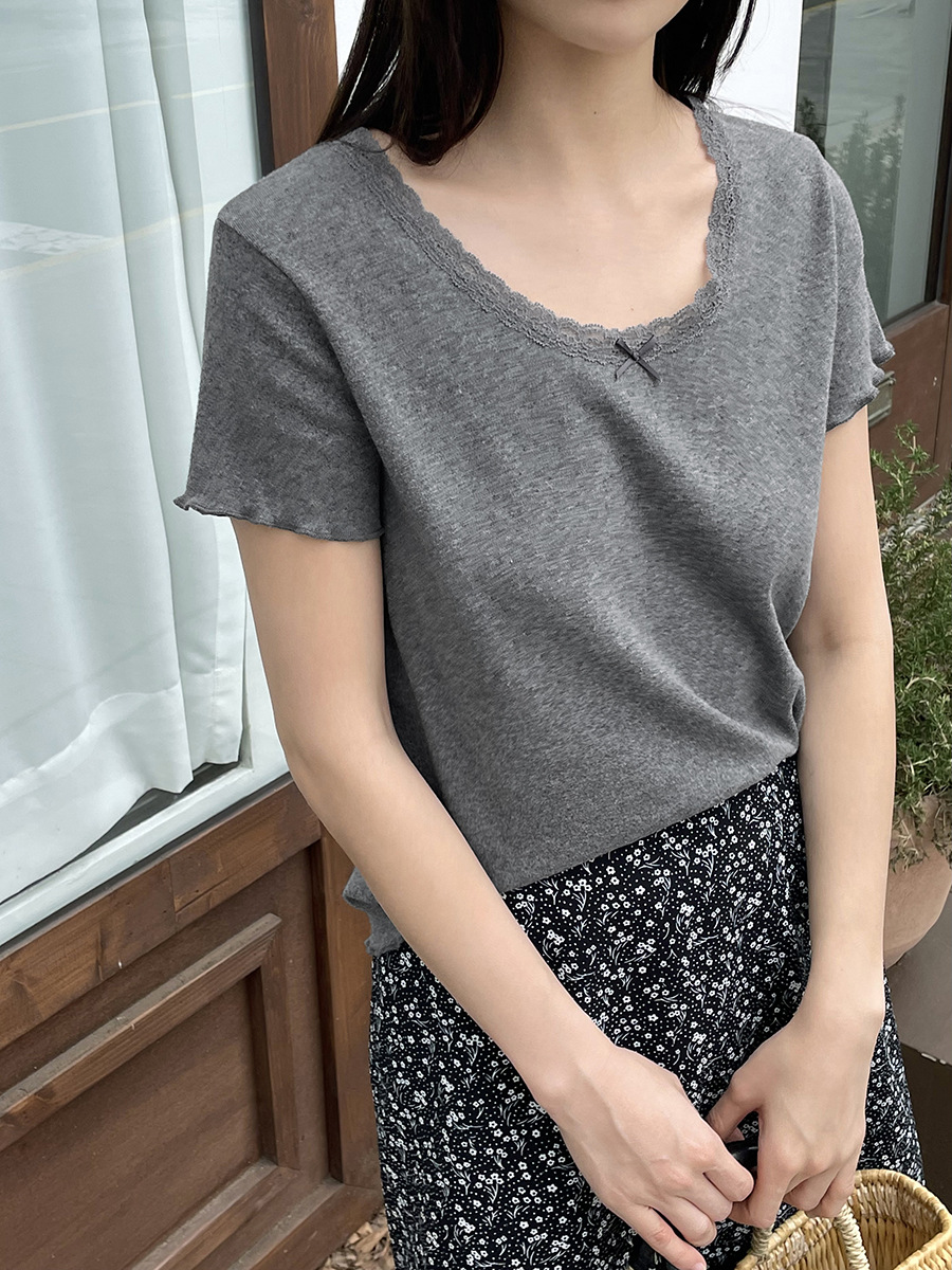 U领修身小飞袖上衣女夏新款领口蕾丝蝴蝶结亲肤舒适T恤