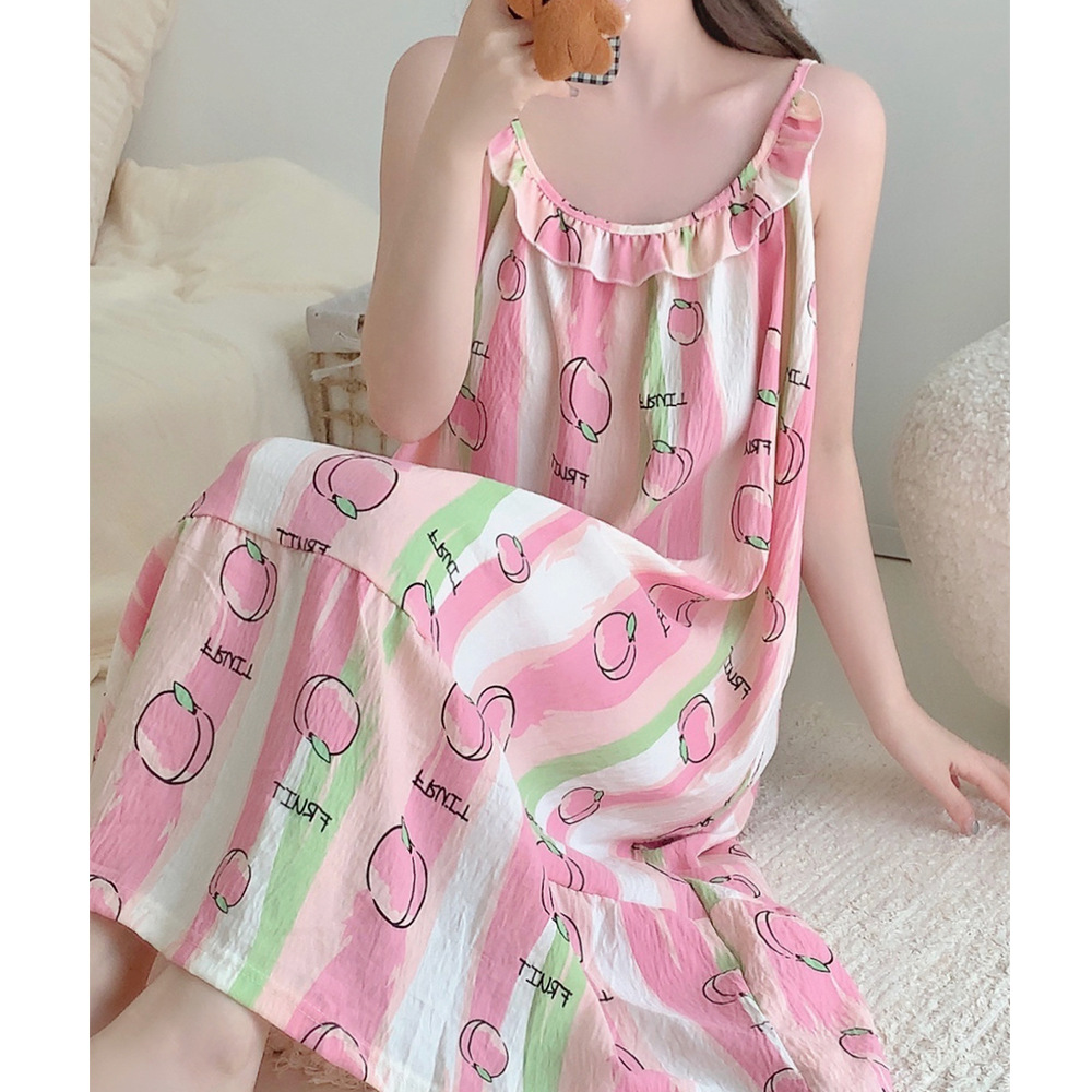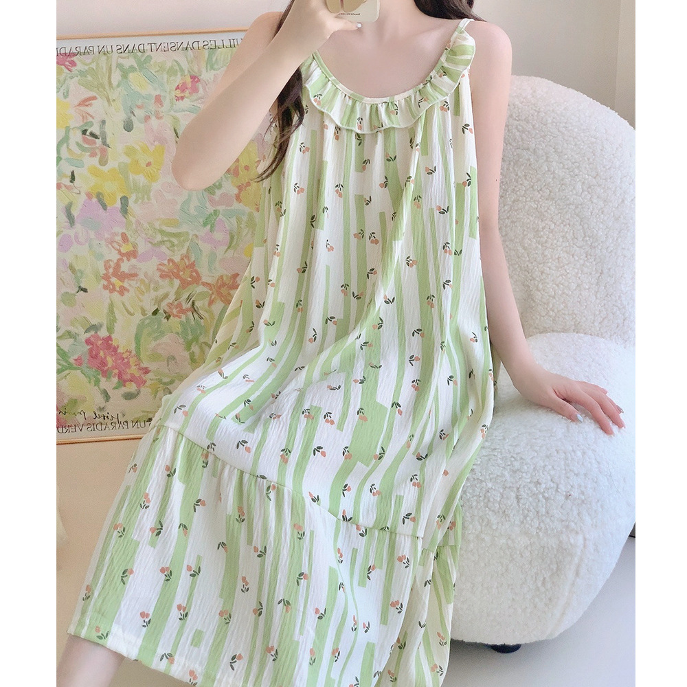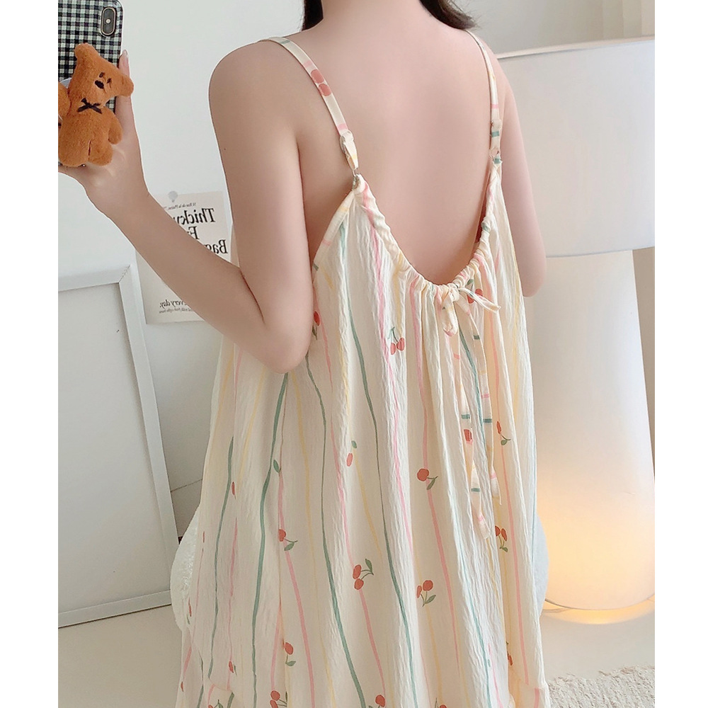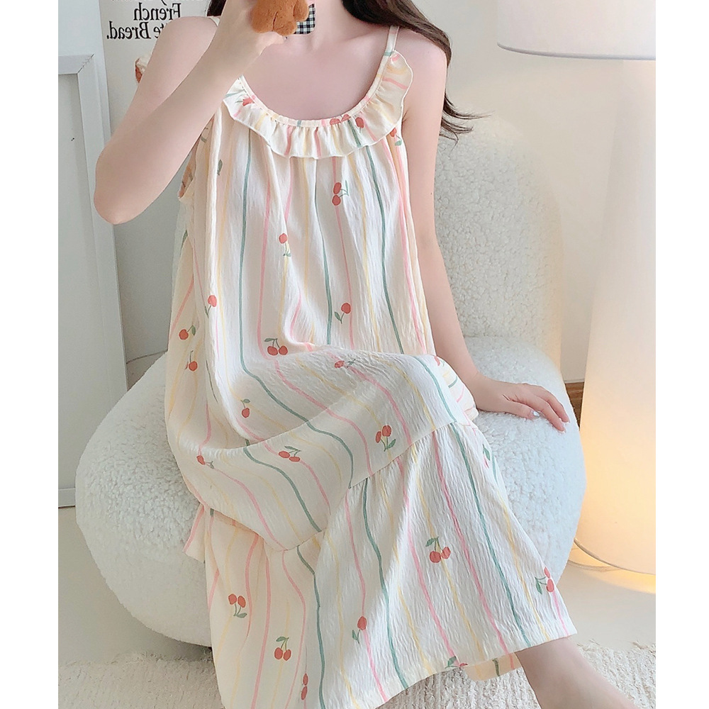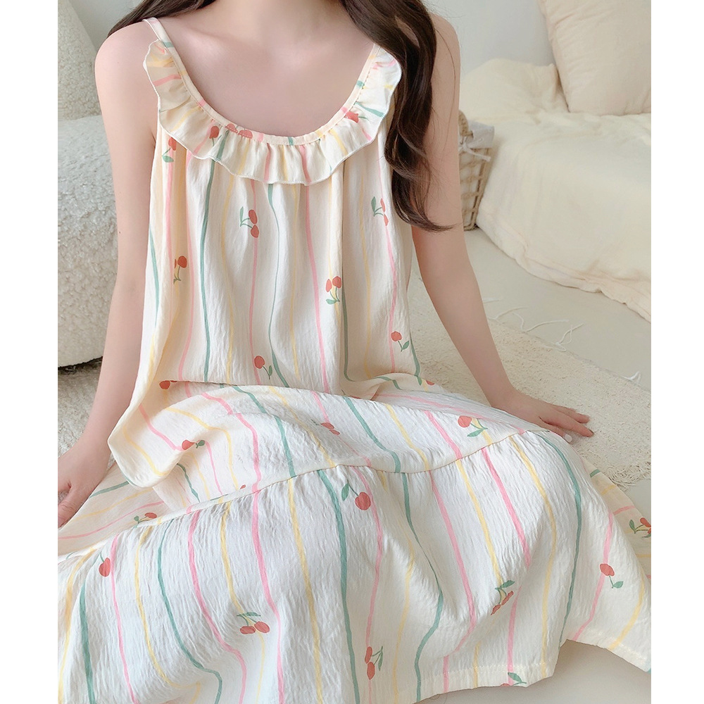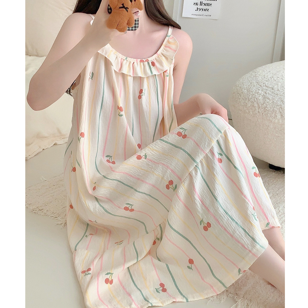 日系甜美吊带睡裙女夏季纯棉中长款条纹可外穿夏天学生睡衣家居服