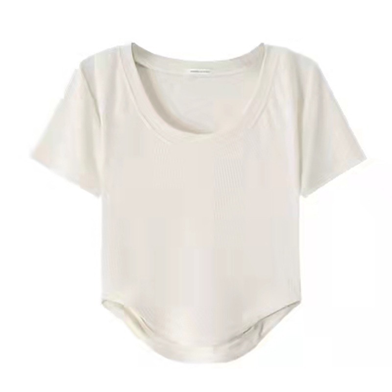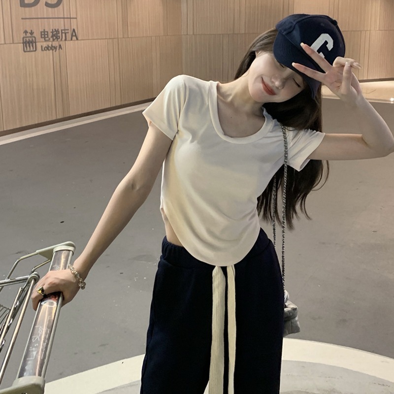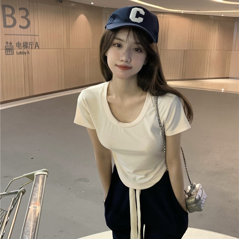 不规则下摆辣妹修身正肩t恤女上衣夏季设计感U领白色短袖