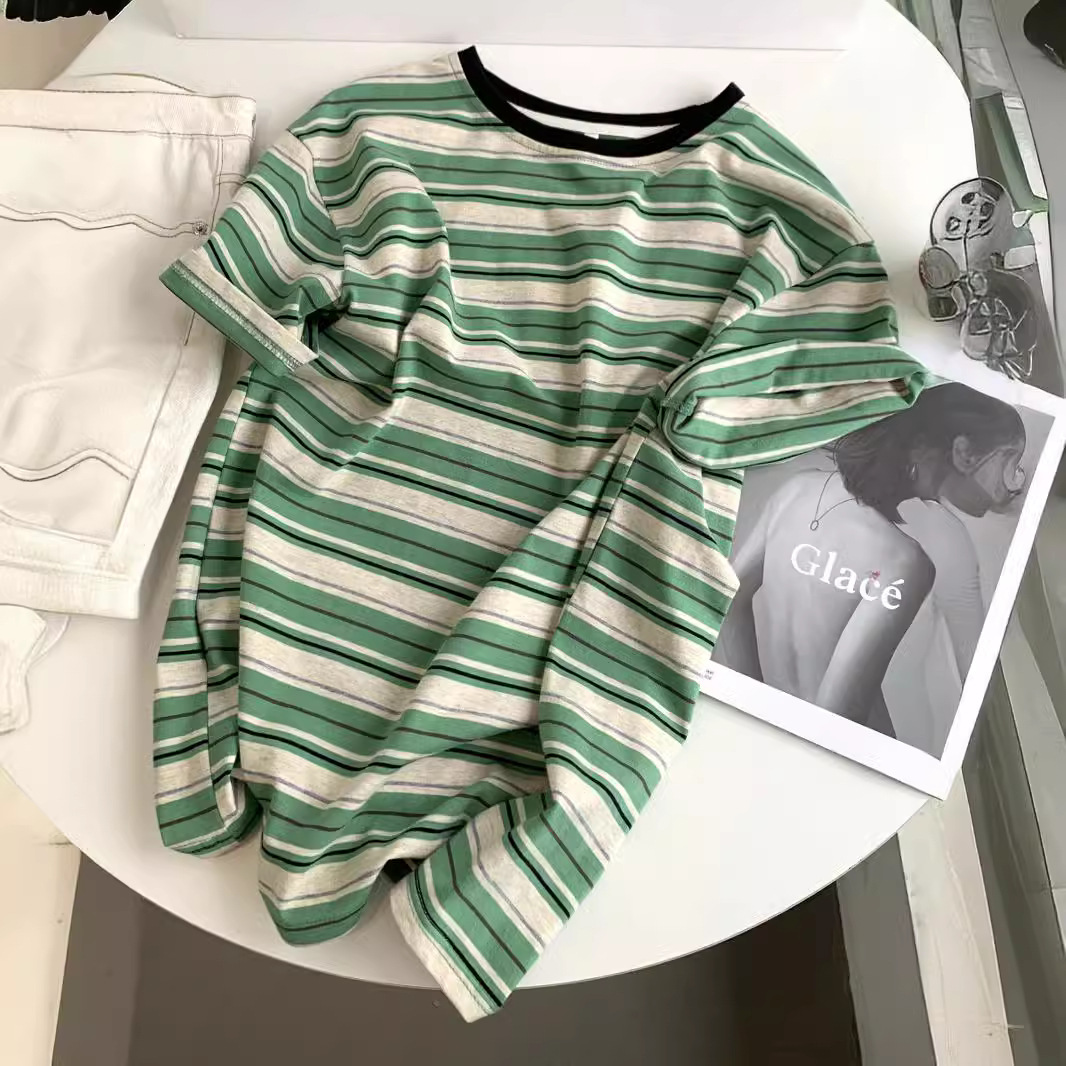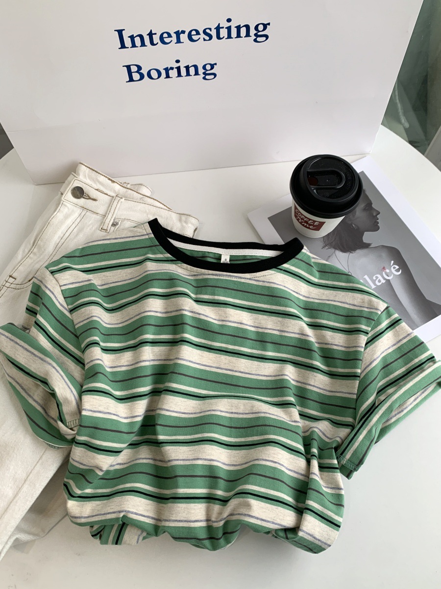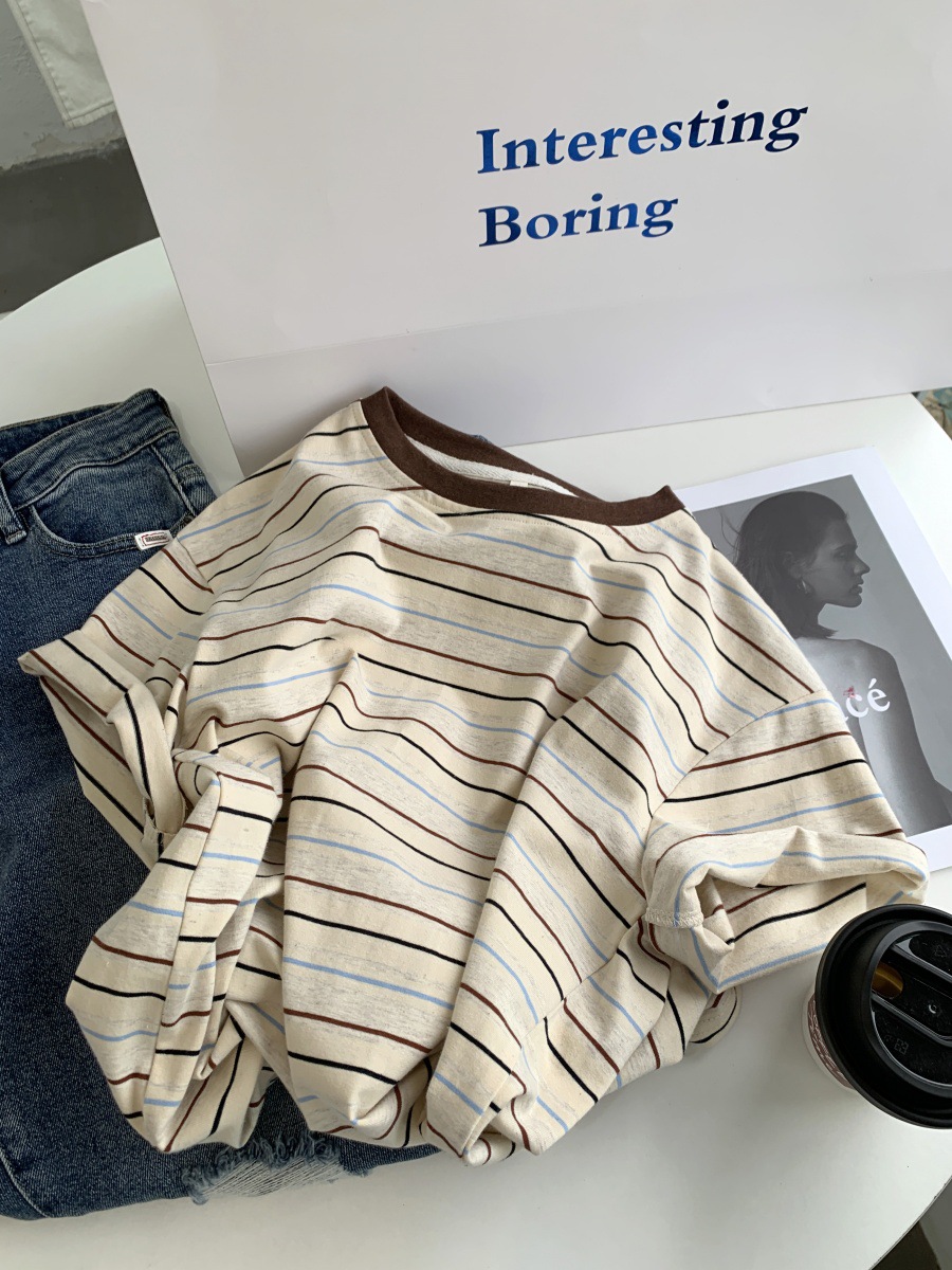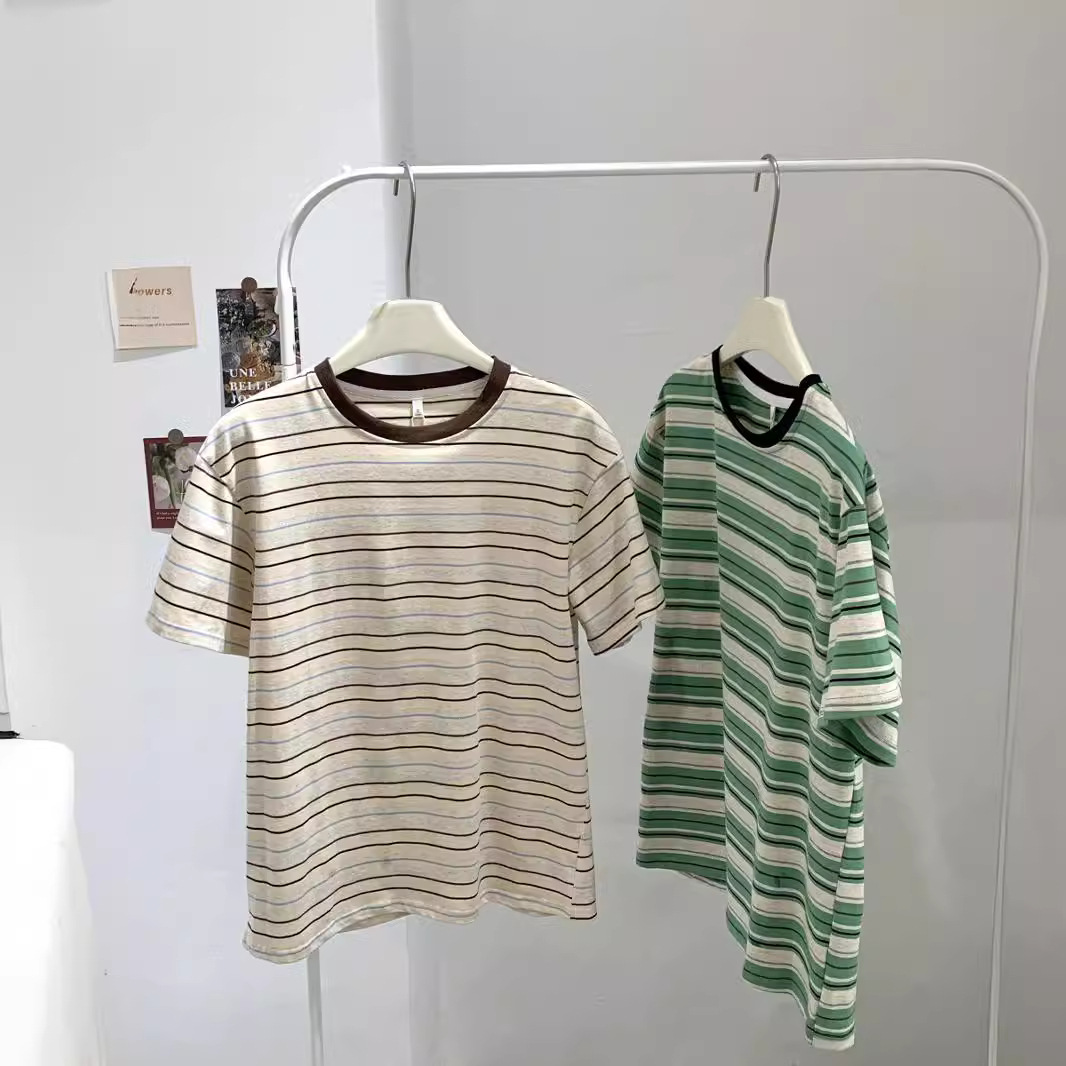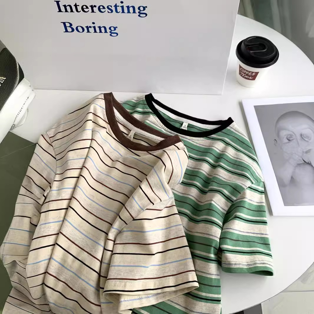 复古条纹撞色T恤女港味宽松百搭上衣夏季chic减龄休闲正肩短袖潮