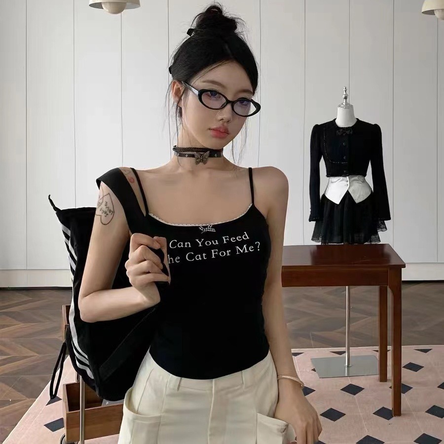 甜辣妹白色字母印花背心小吊带女夏季内搭短款蝴蝶结修身上衣外穿