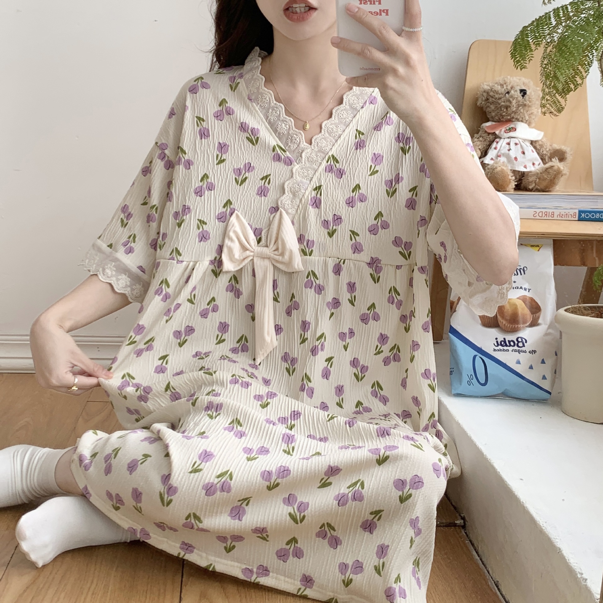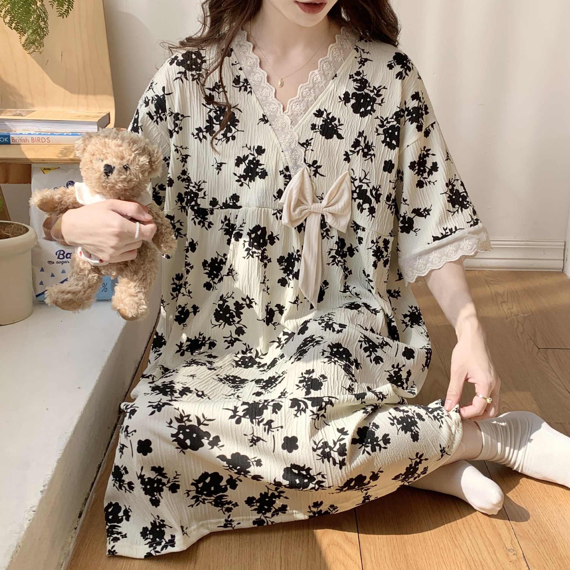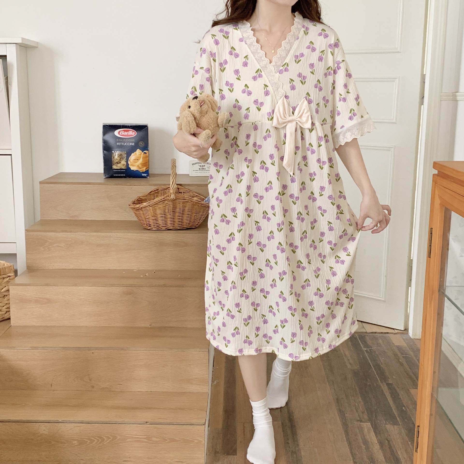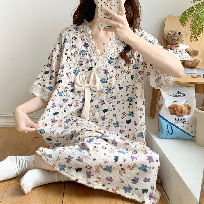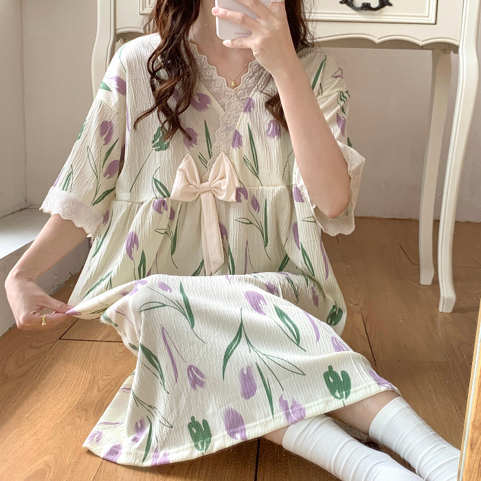 夏季短袖睡裙女日式和服蝴蝶结甜美郁金香宽松大码家居服