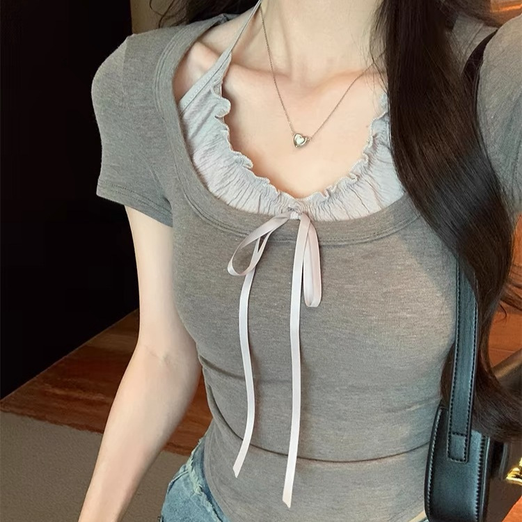 欧美纯欲挂脖假两件短袖t恤女灰色夏季显瘦上衣