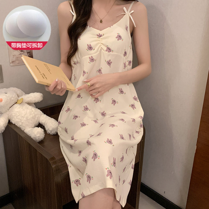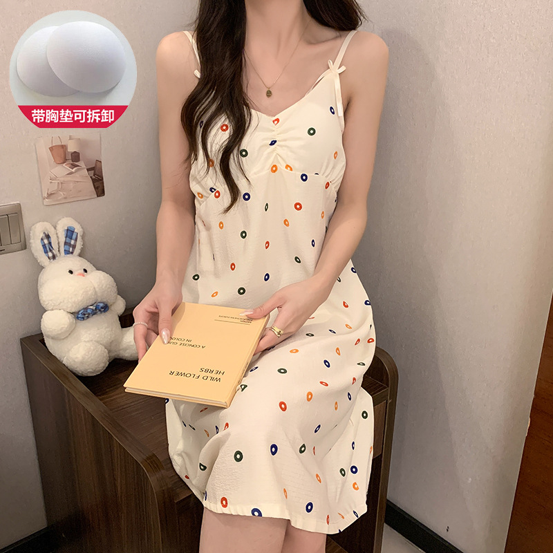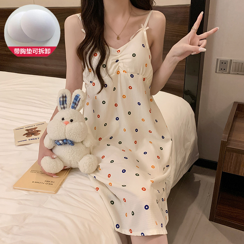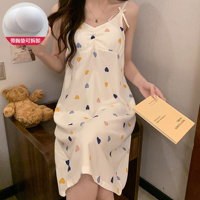 ins韩版彩色爱心甜美带胸垫吊带睡裙女夏季可爱泡泡棉宽松中长款